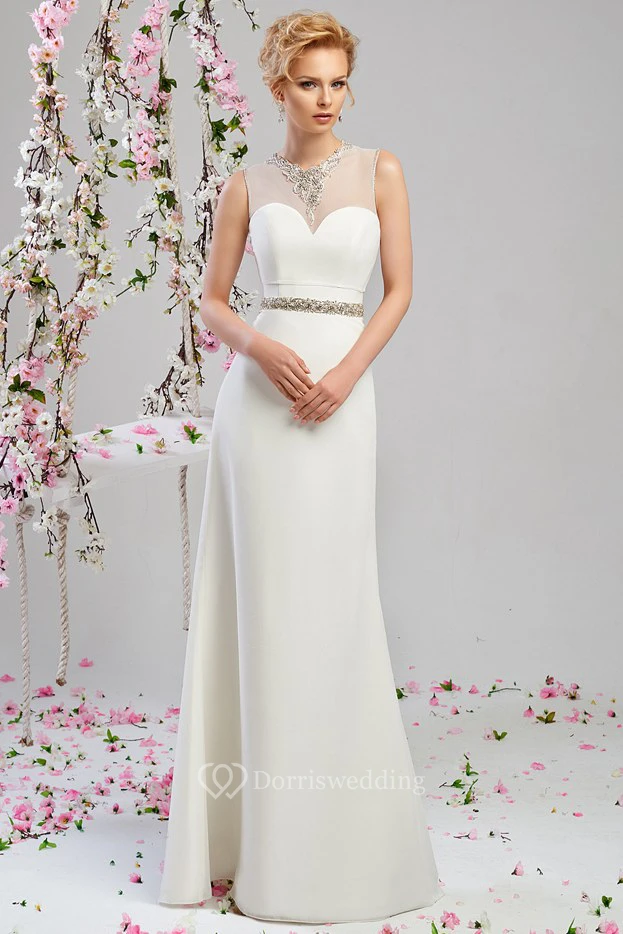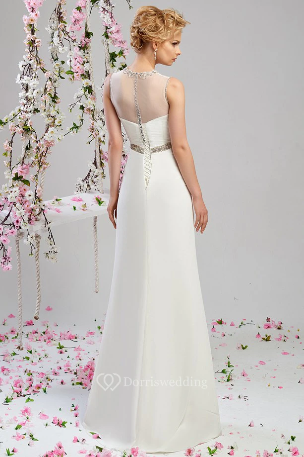 Sheath Floor-Length Jeweled Sleeveless High Neck Chiffon Wedding Dress With Beading And Illusion