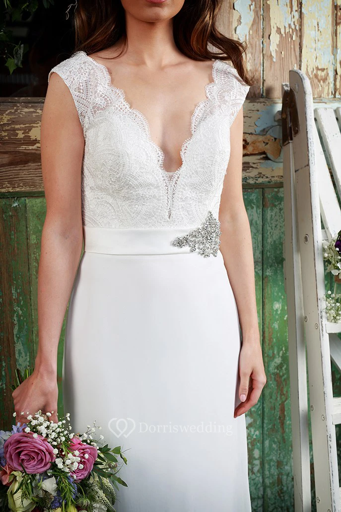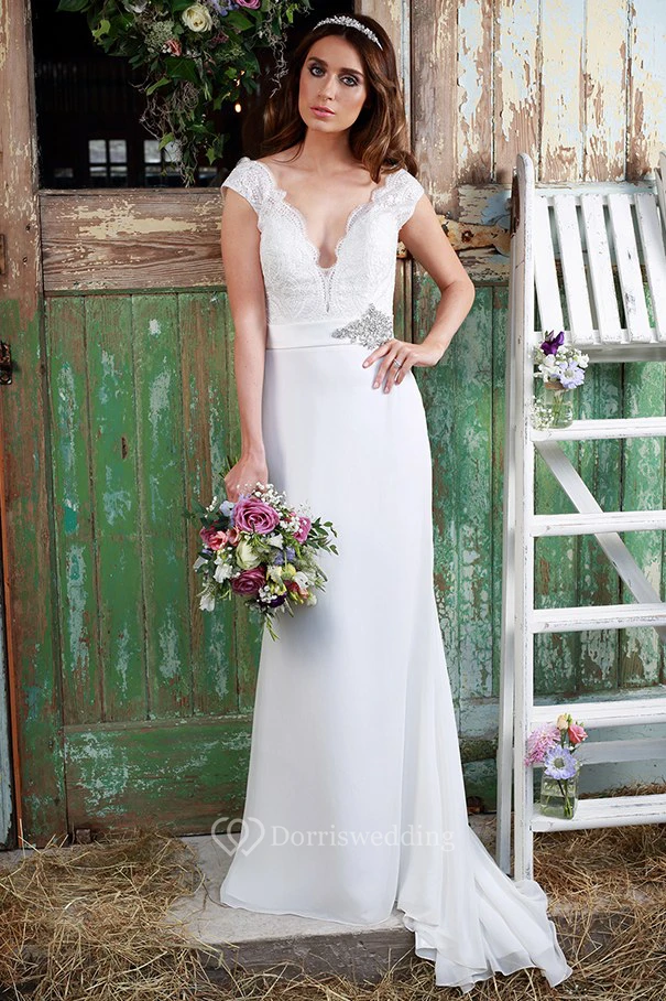 Sheath Floor-Length Jeweled V-Neck Cap-Sleeve Satin&Chiffon Wedding Dress With Lace