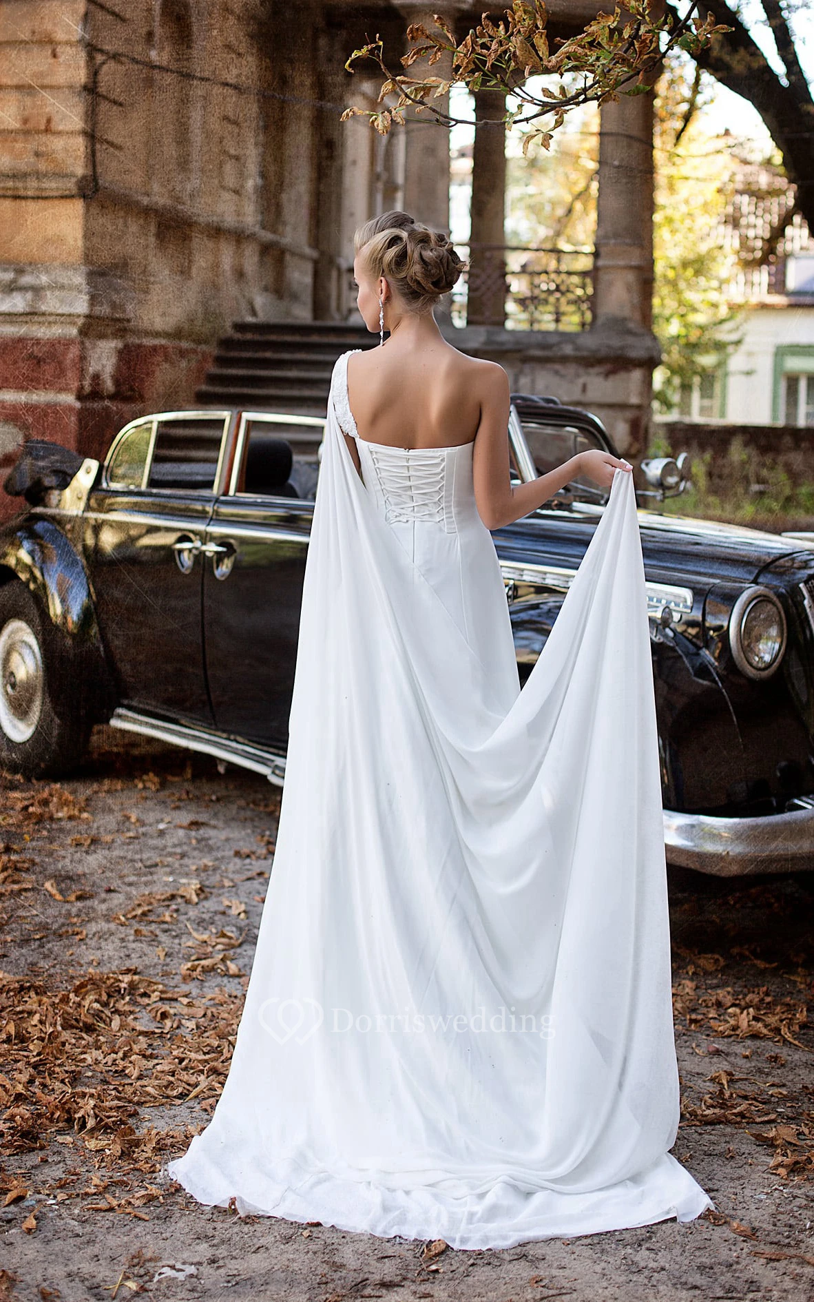 Sheath Floor-Length One-Shoulder Sleeveless Empire Lace-Up Chiffon Dress With Appliques And Beading