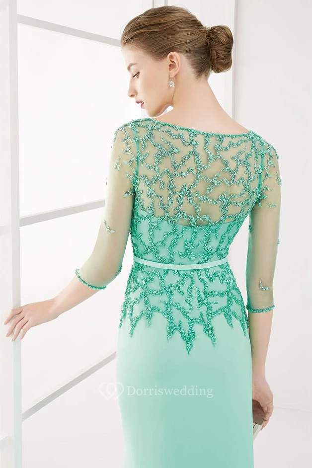Sheath Floor-Length Scoop-Neck Beaded 3-4-Sleeve Satin Prom Dress