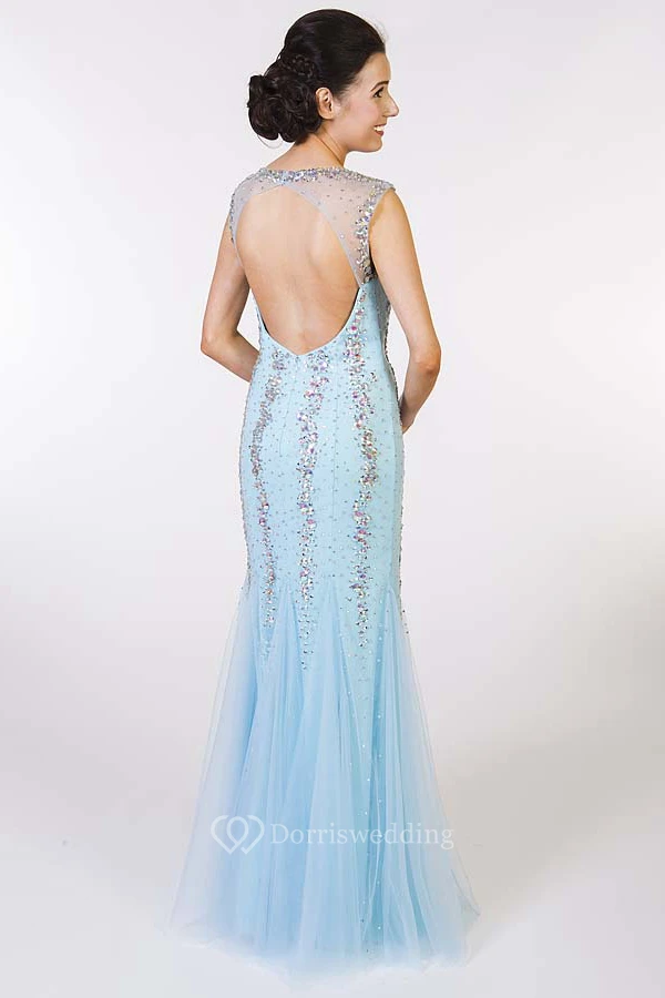 Sheath Floor-Length Scoop-Neck Beaded Sleeveless Tulle Prom Dress