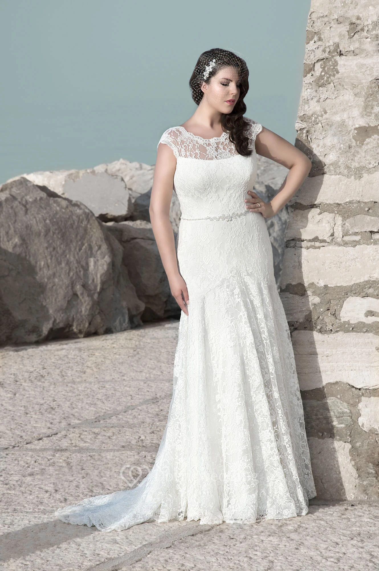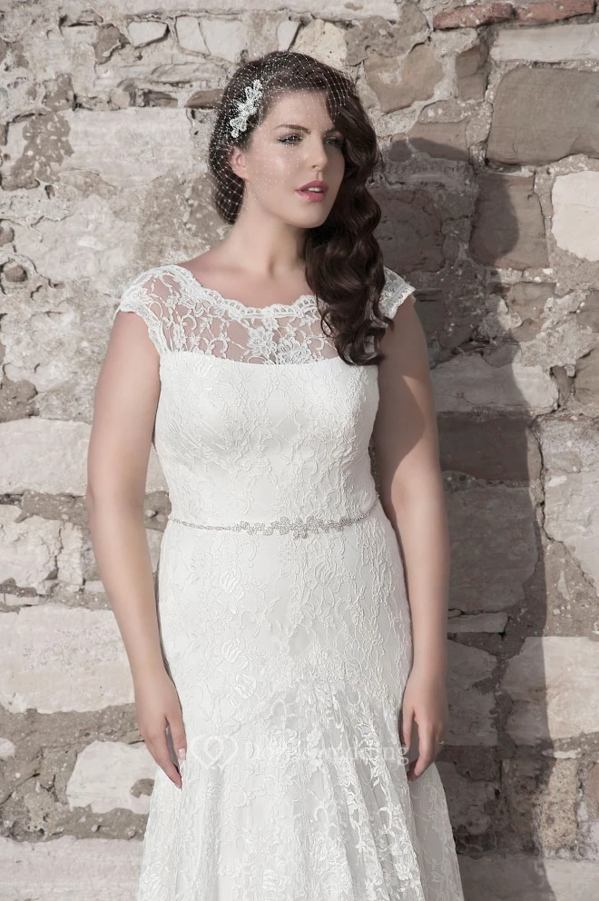 Sheath Floor-Length Scoop Neck Cap Lace Sweep Train Waist Jewellery Dress