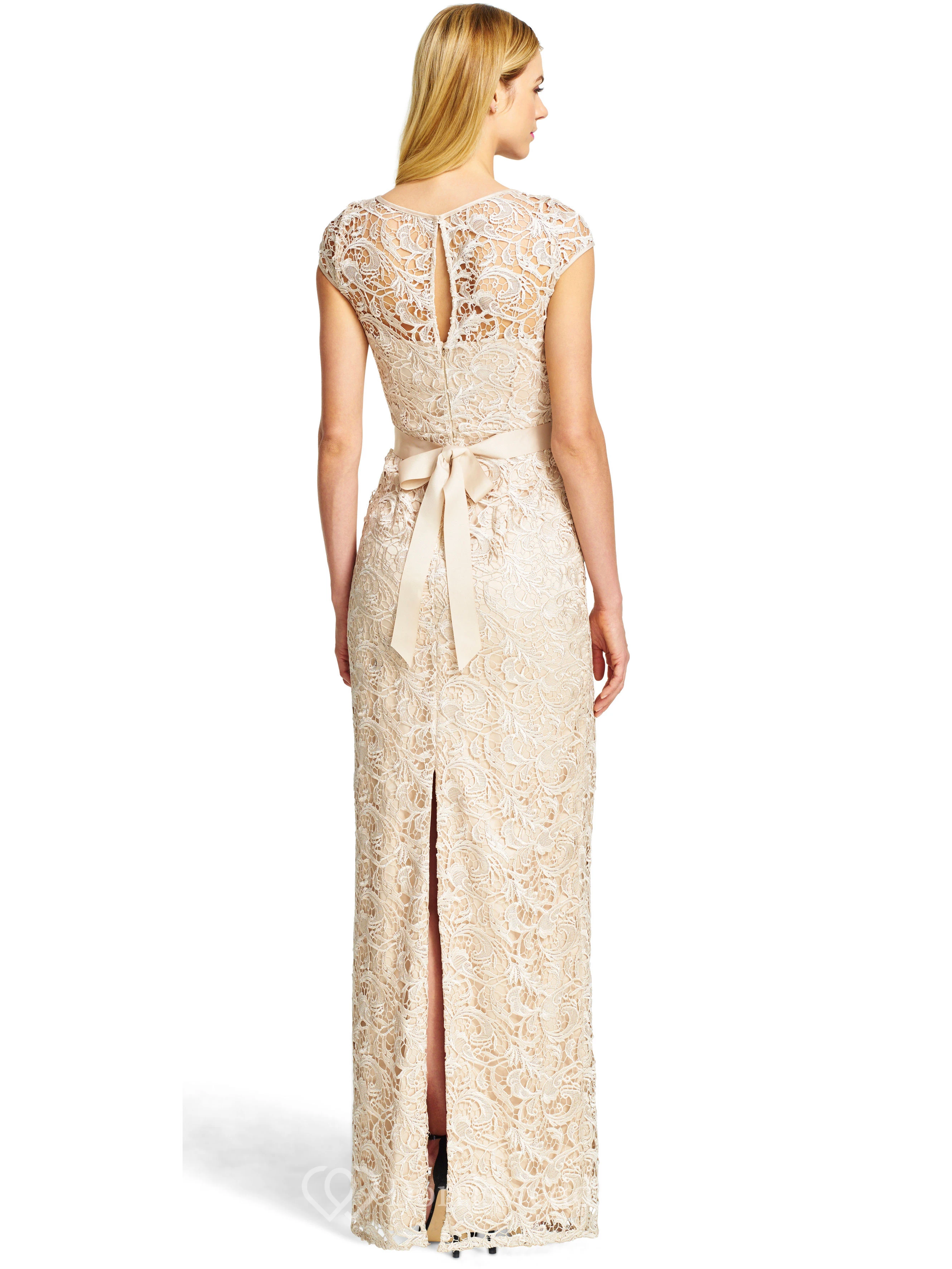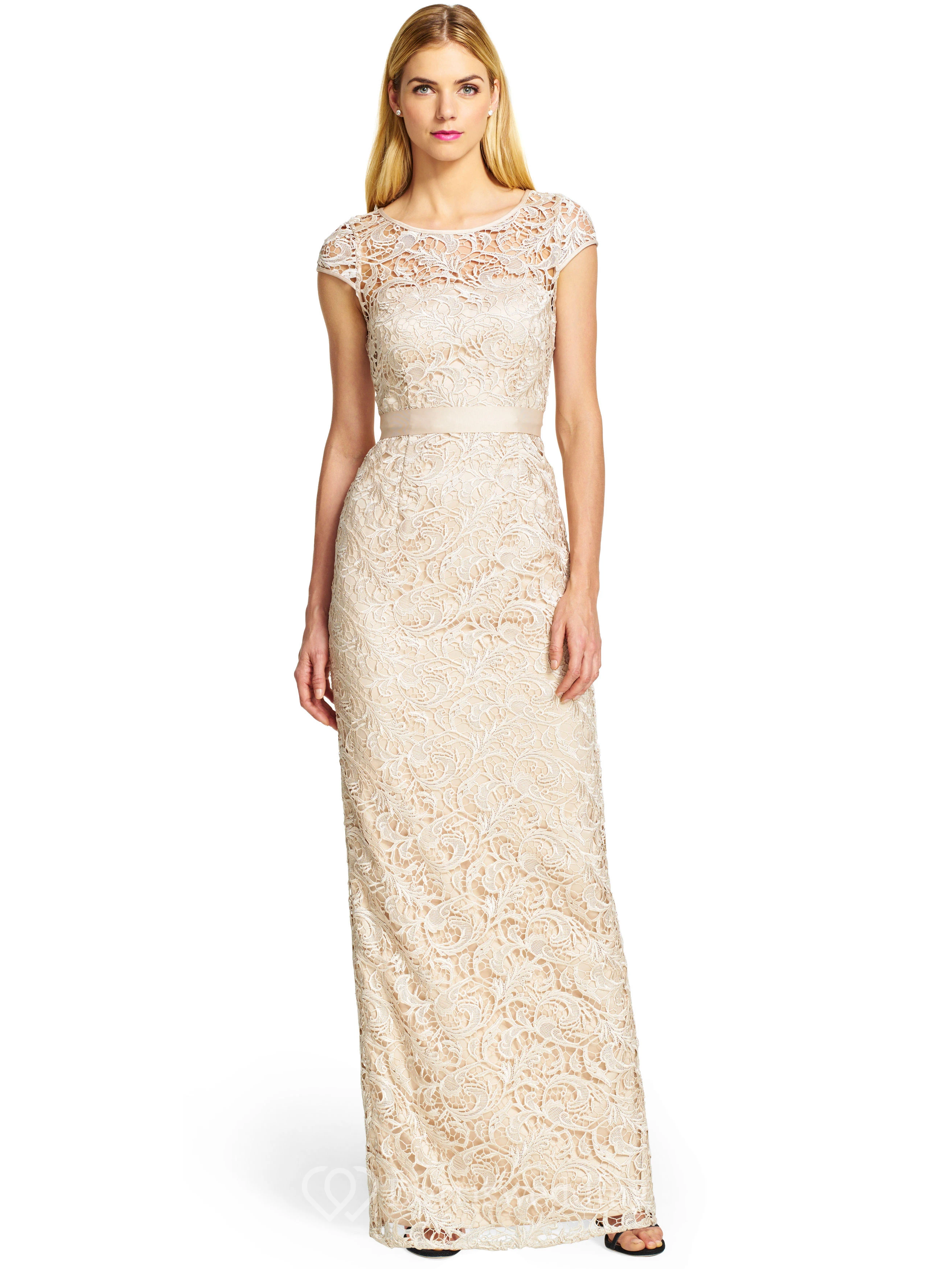 Sheath Floor-Length Scoop Neck Cap Sleeve Bowed Lace Bridesmaid Dress