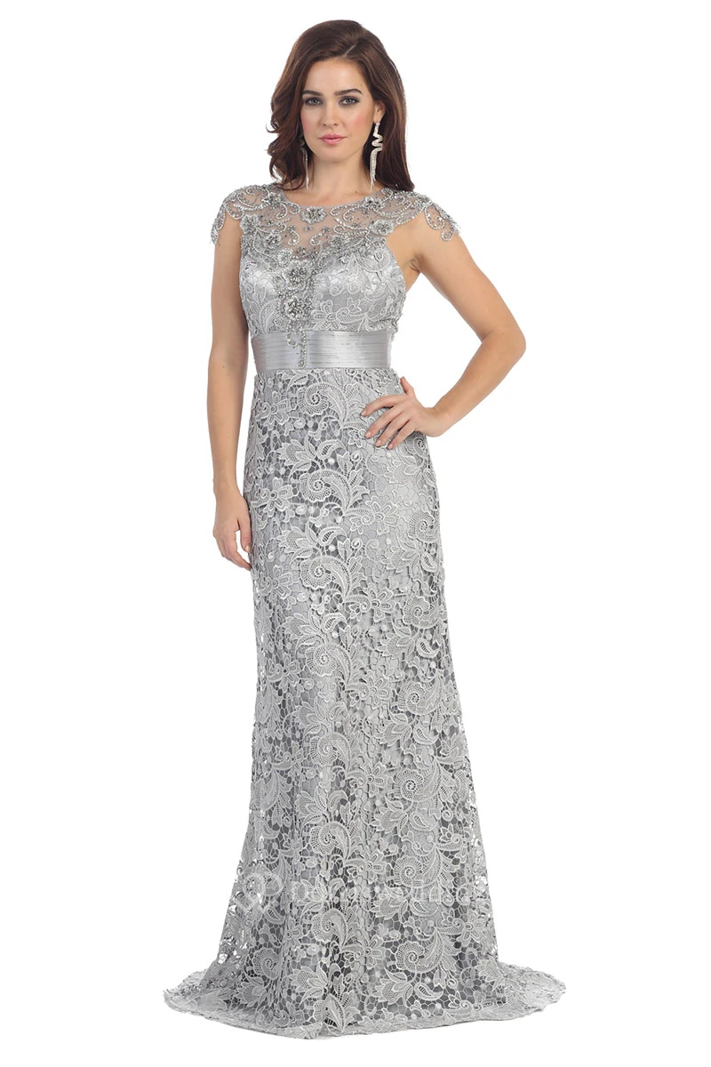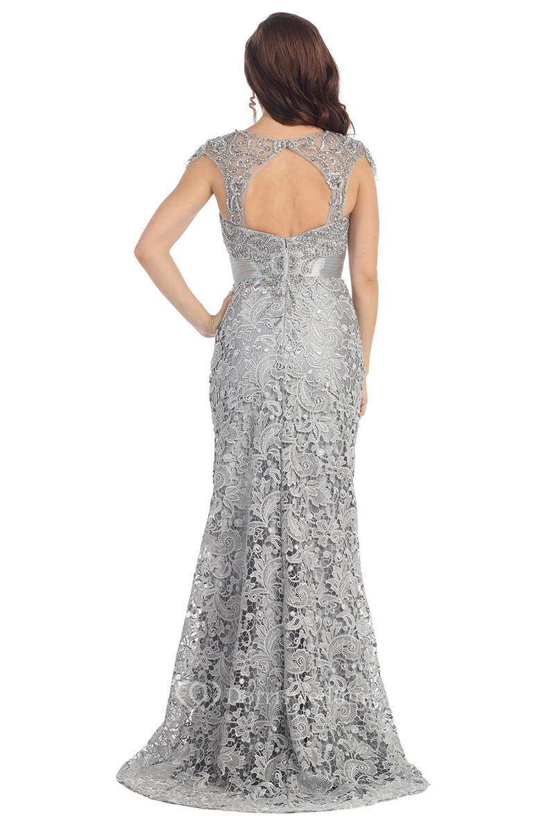 Sheath Floor-Length Scoop-Neck Cap-Sleeve Lace Sweep Train Keyhole Dress