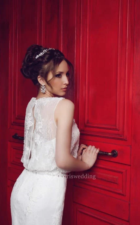Sheath Floor-Length Scoop Sleeveless Illusion Lace Dress With Appliques And Waist Jewellery
