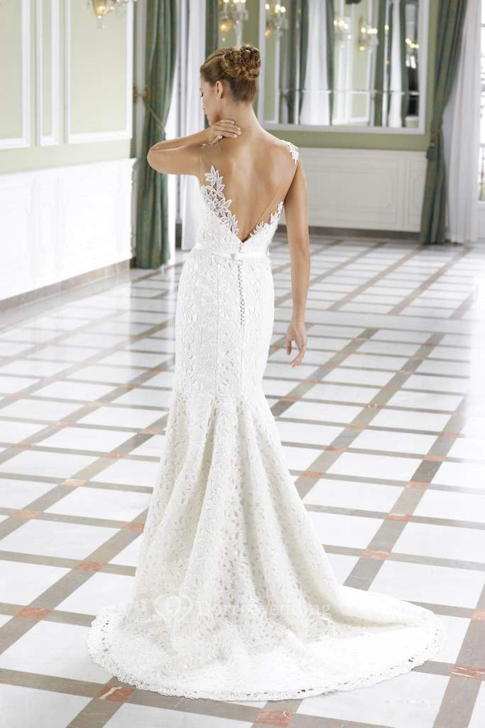 Sheath Floor-Length Scoop Sleeveless Lace Wedding Dress With Brush Train And Deep-V Back