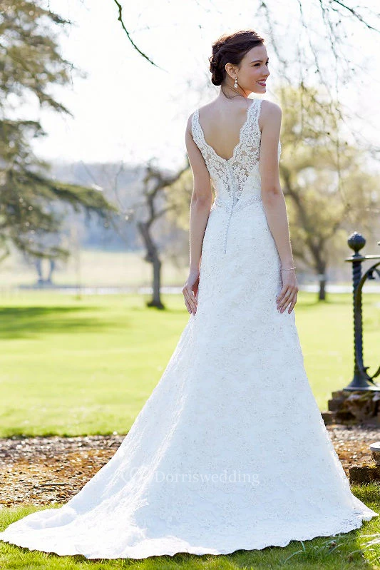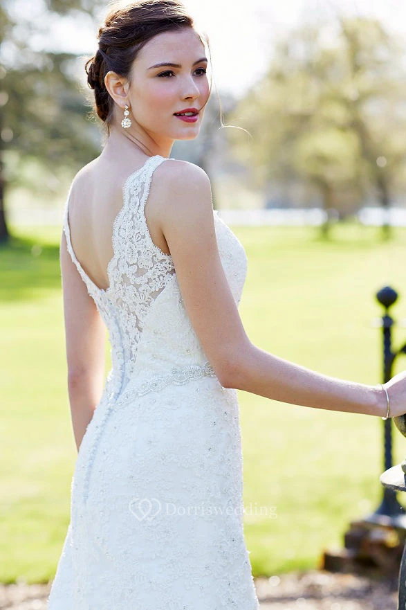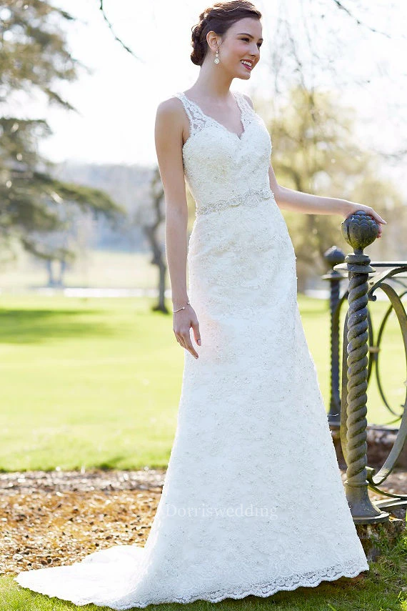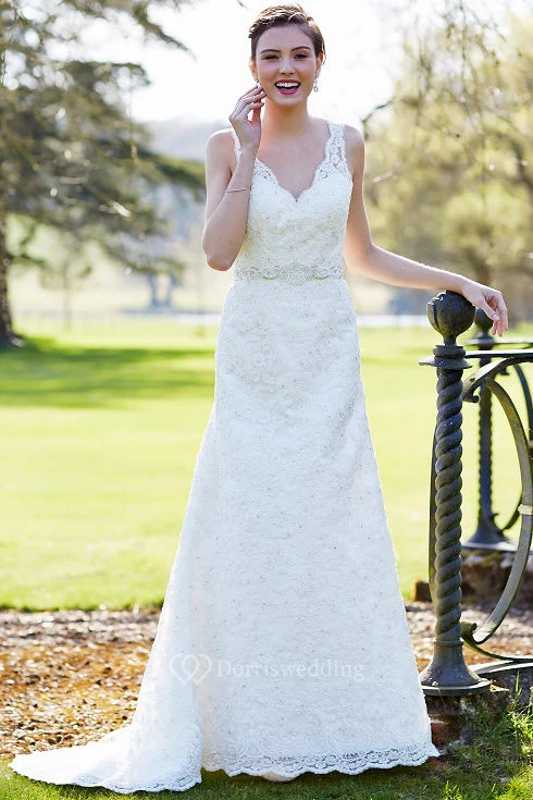 Sheath Floor-Length Sleeveless Appliqued V-Neck Lace Wedding Dress With Waist Jewellery