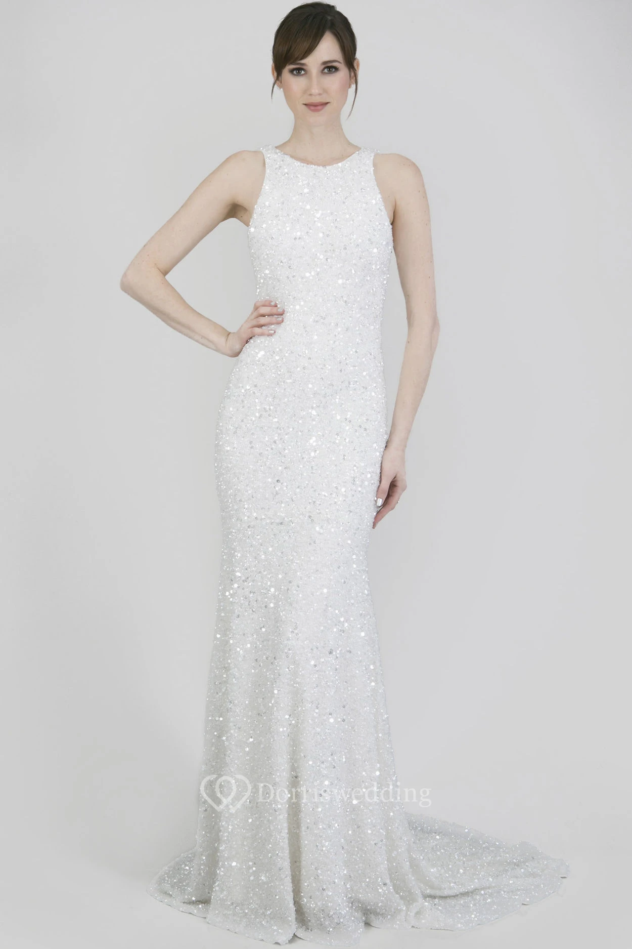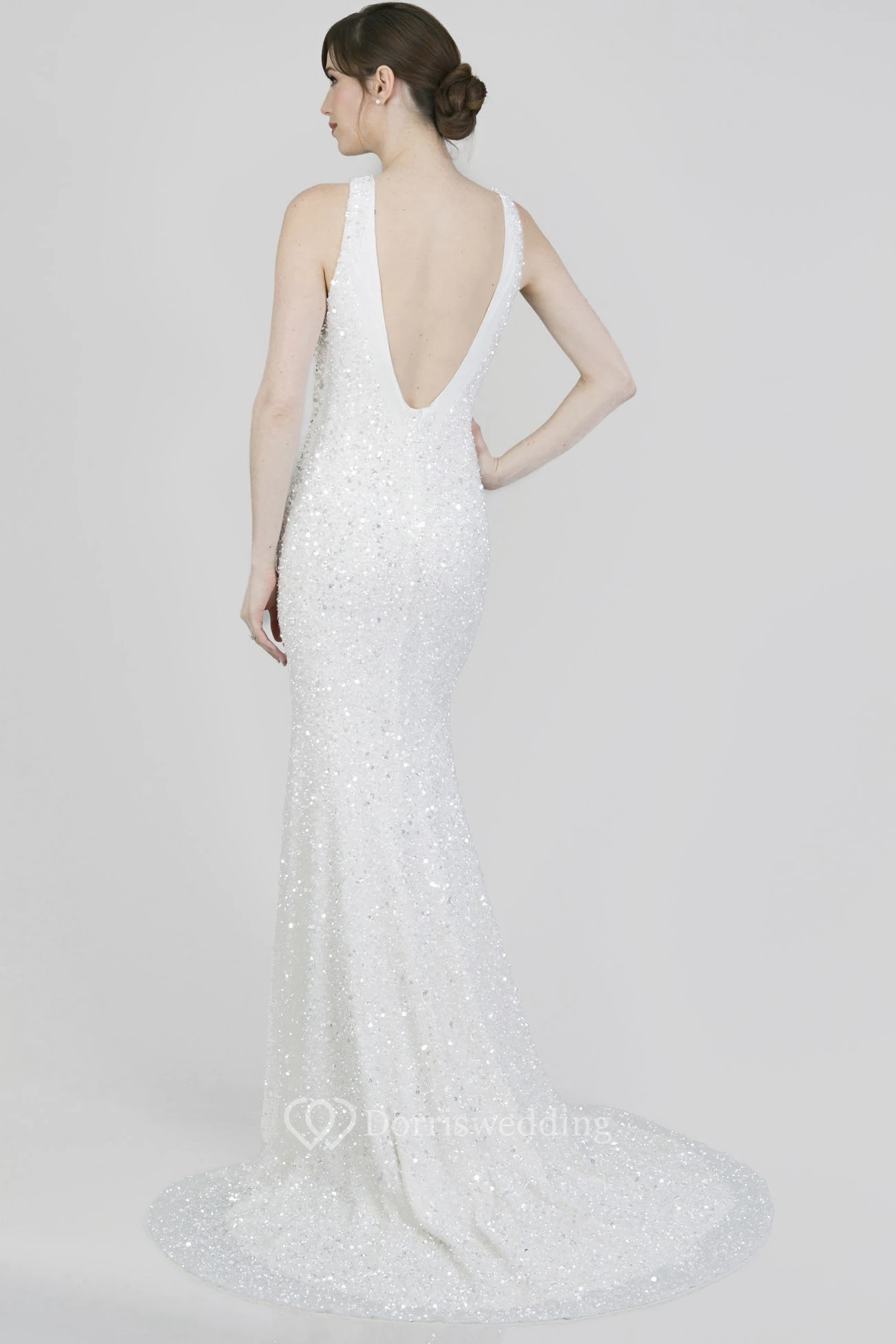 Sheath Floor-Length Sleeveless Beaded Jewel Sequins Wedding Dress With Deep-V Back And Sweep Train