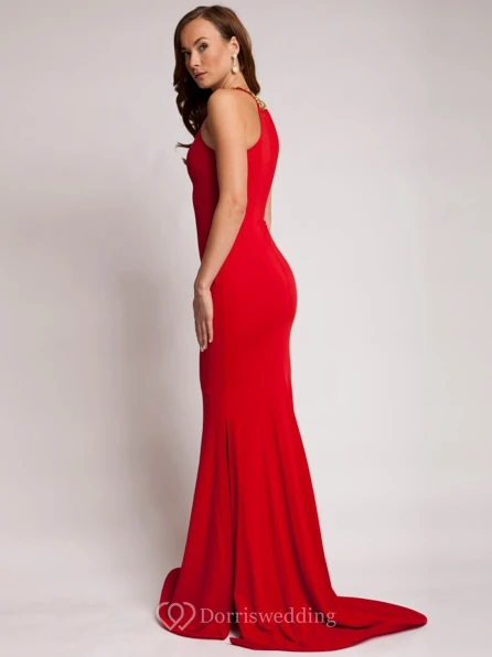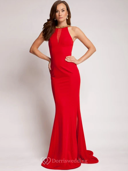 Sheath Floor-Length Sleeveless Jewel Jersey Prom Dress With Brush Train
