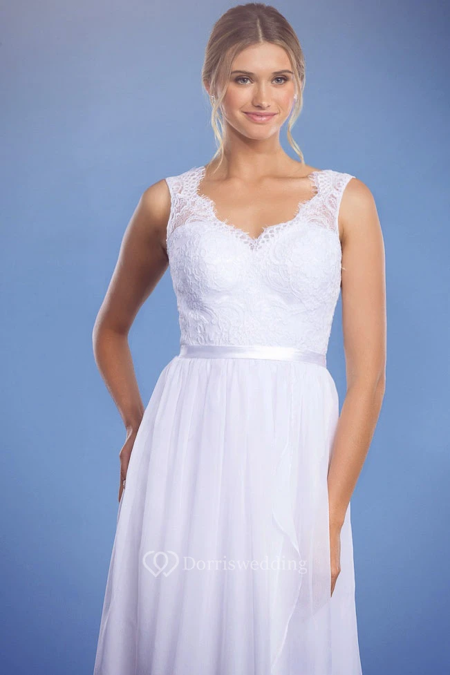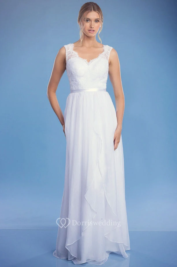 Sheath Floor-Length Sleeveless Lace V-Neck Wedding Dress With Draping