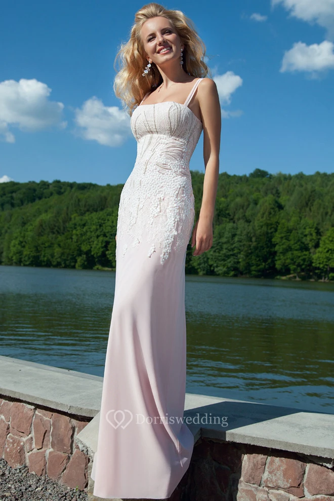 Sheath Floor-Length Strapped Sleeveless Beaded Chiffon Prom Dress With Appliques