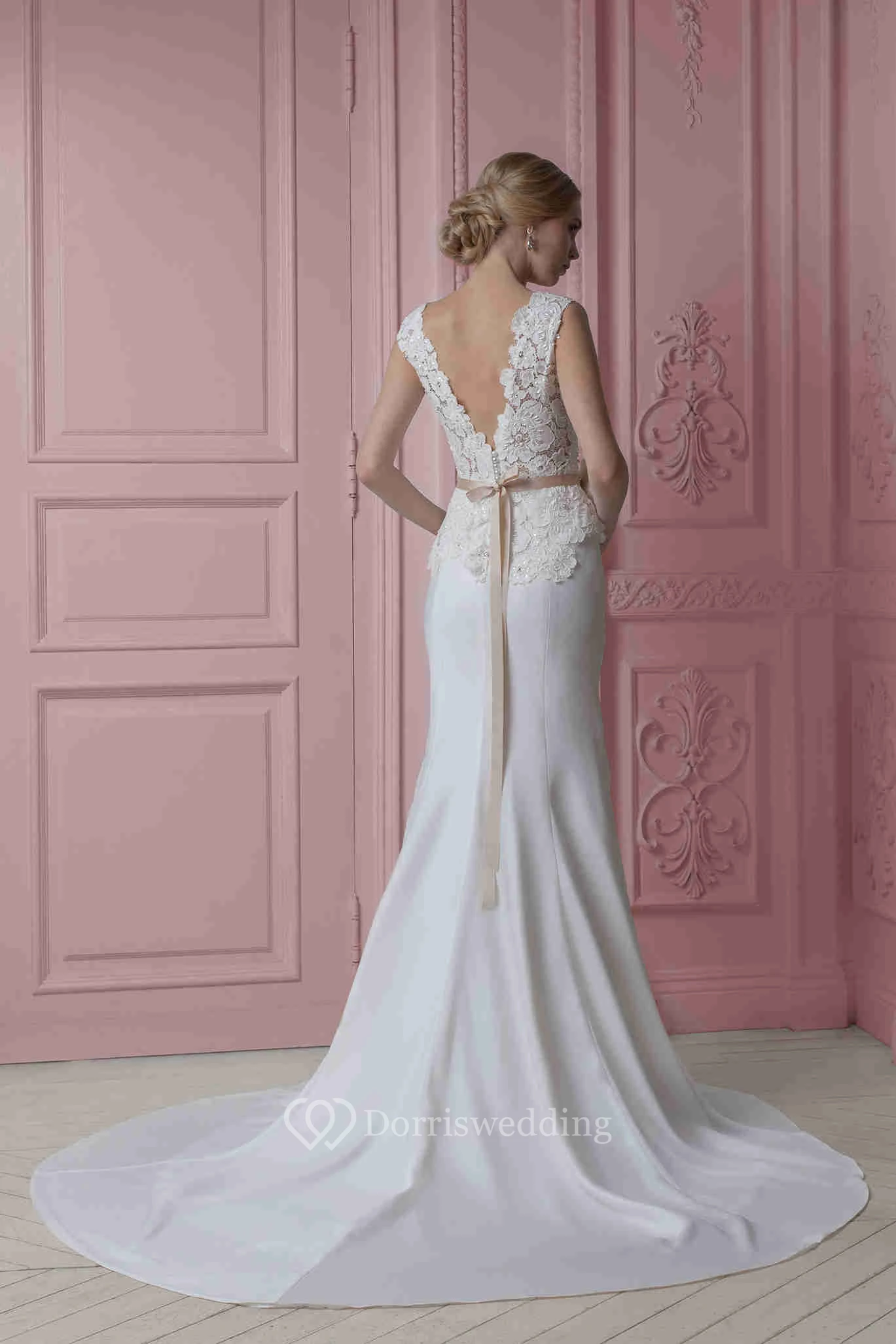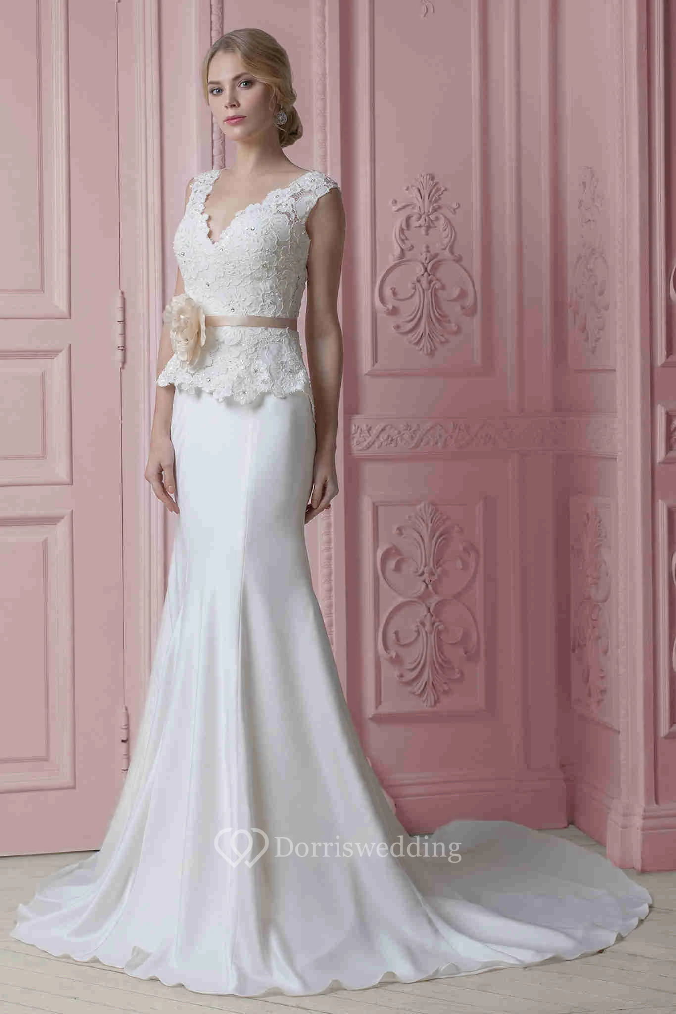 Sheath Floor-Length V-Neck Appliqued Sleeveless Stretched Satin Wedding Dress With Flower And Ribbon