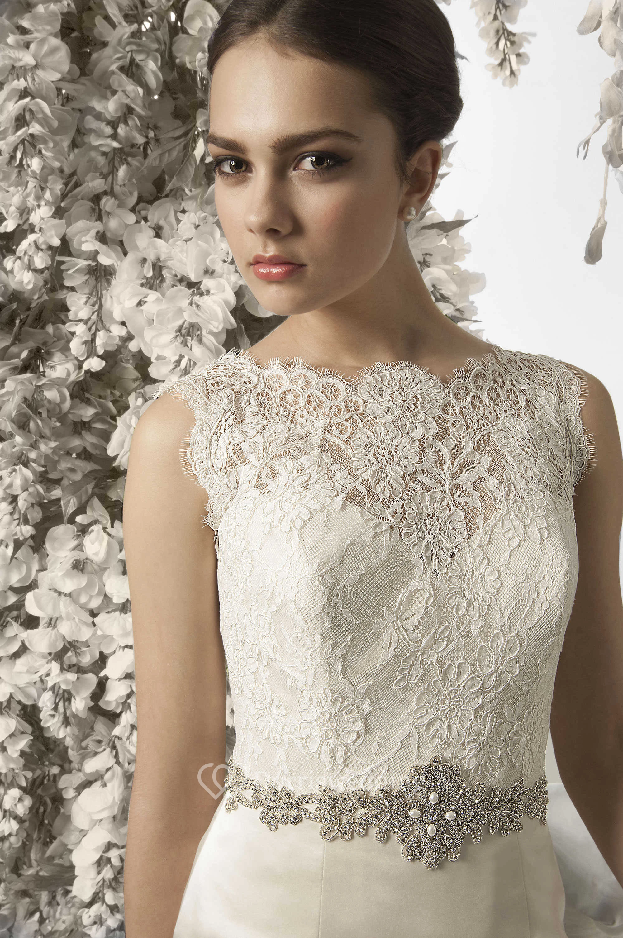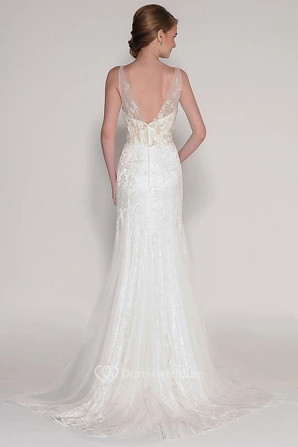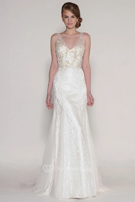 Sheath Floor-Length V-Neck Appliqued Sleeveless Tulle Wedding Dress With Beading