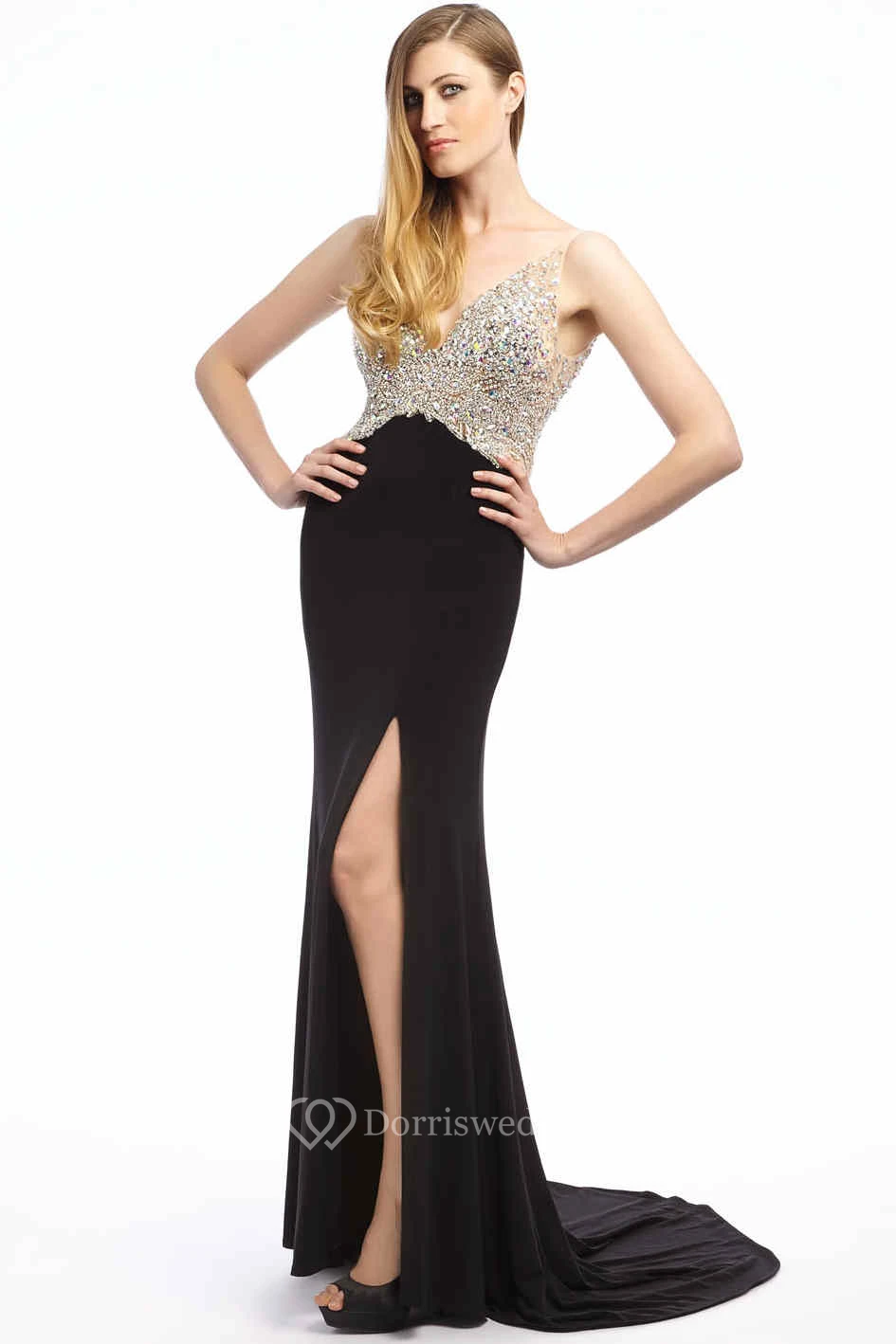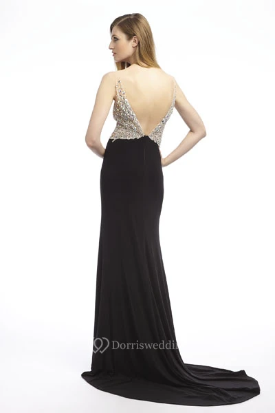 Sheath Floor-Length V-Neck Beaded Sleeveless Jersey Prom Dress With Split Front