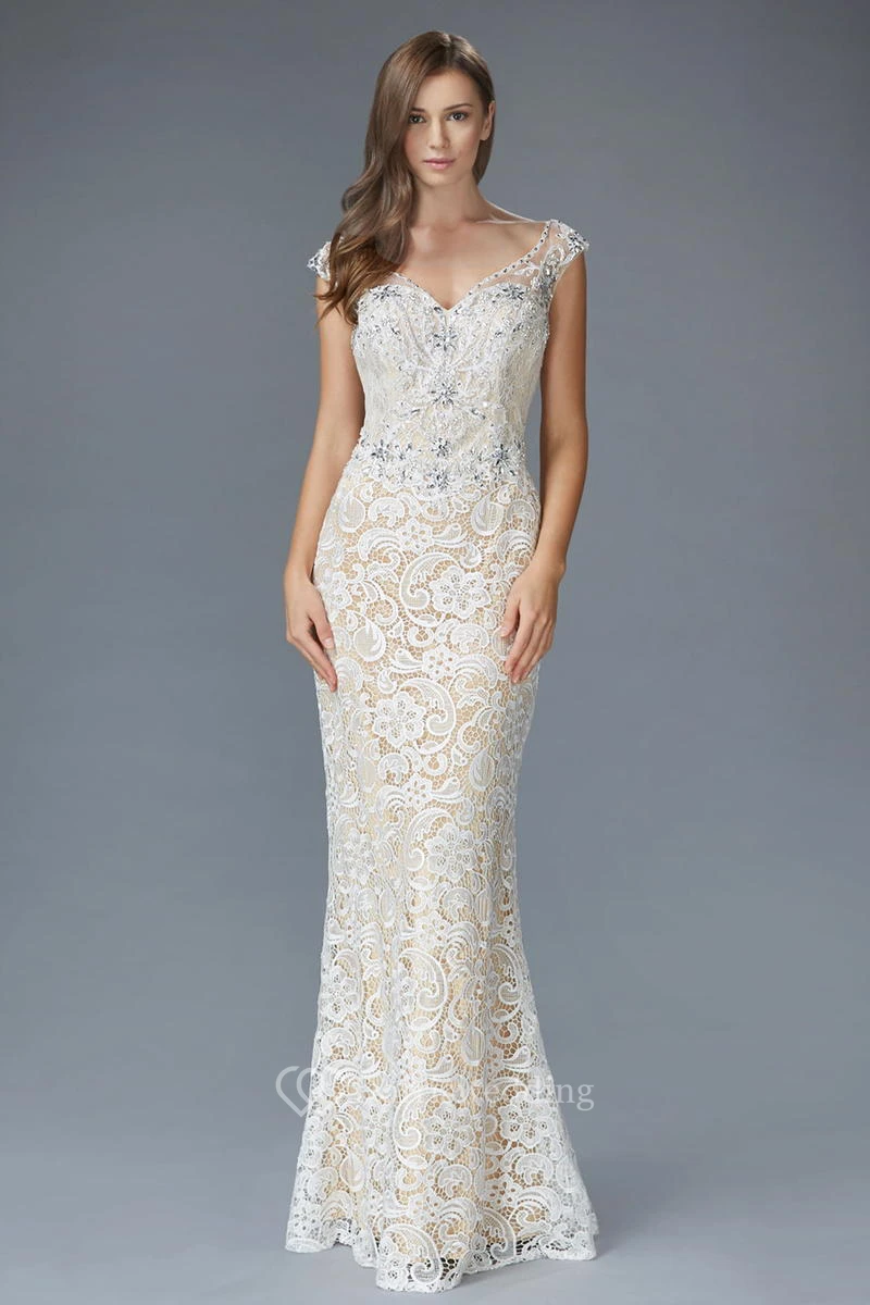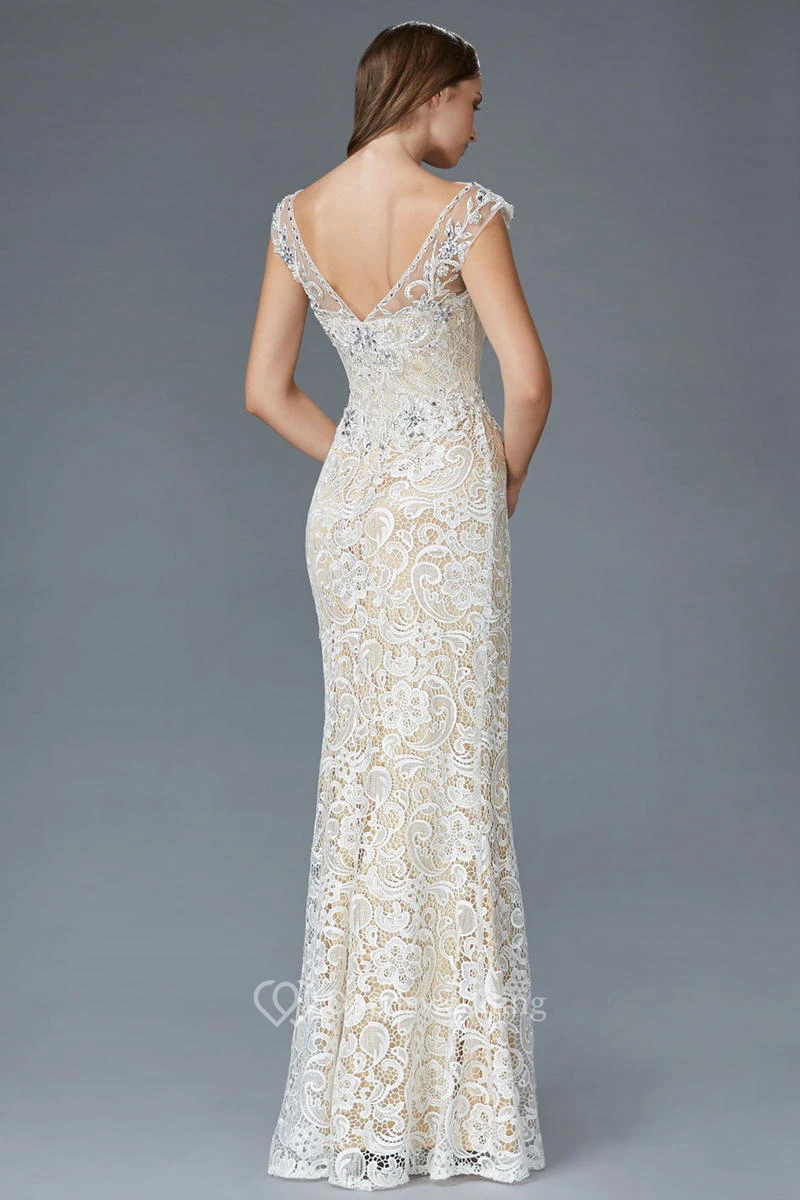 Sheath Floor-Length V-Neck Cap-Sleeve Lace Low-V Back Dress With Beading