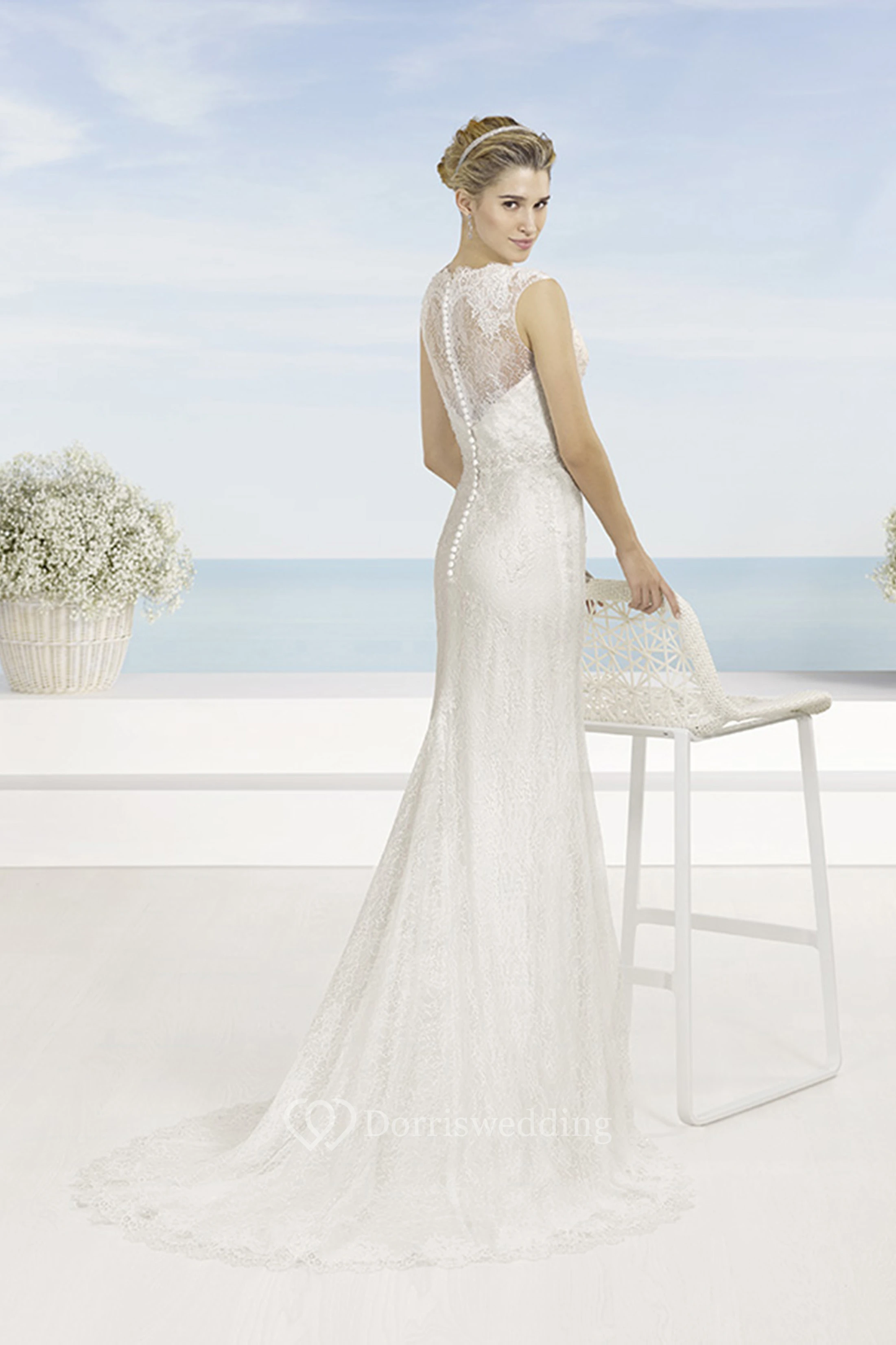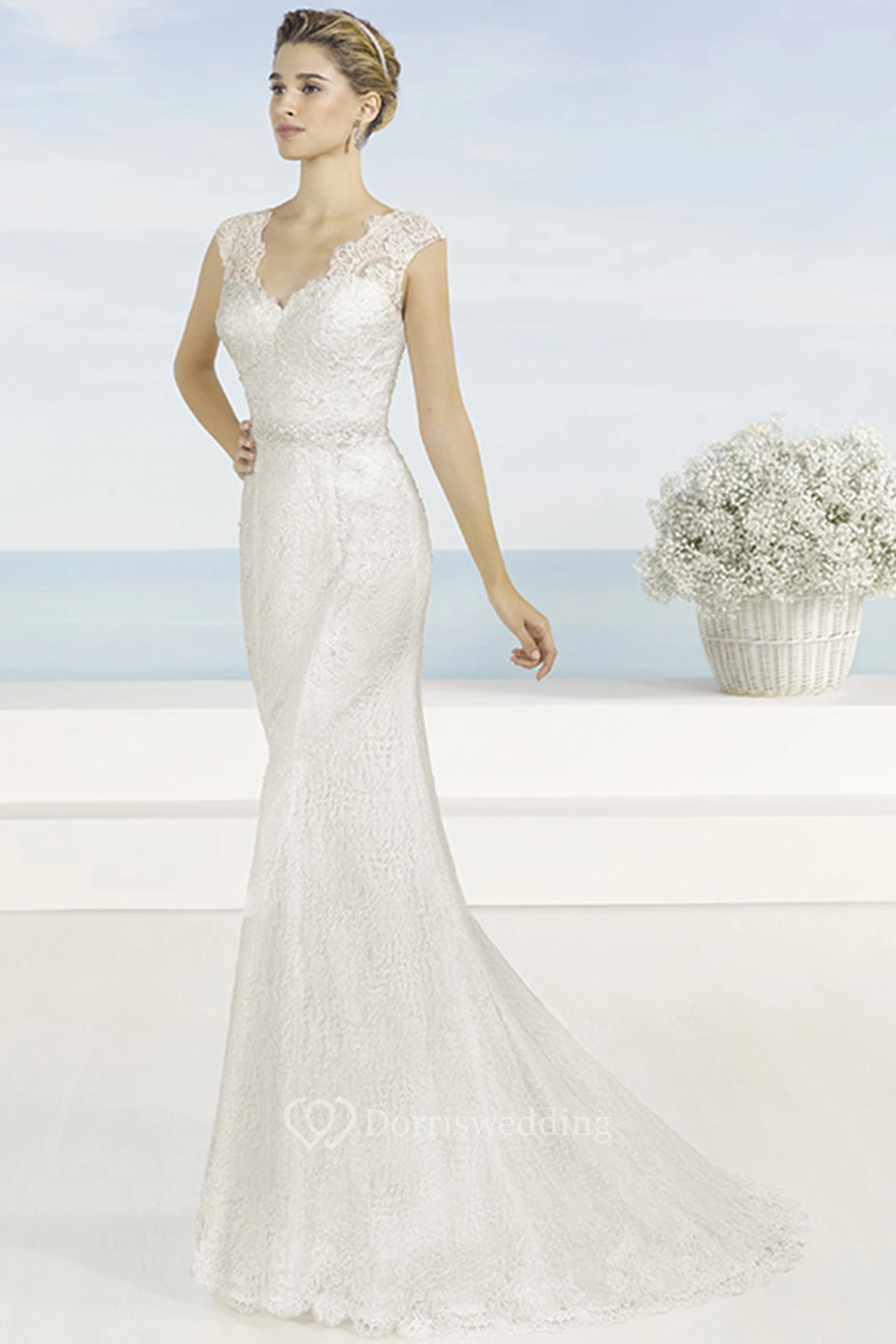 Sheath Floor-Length V-Neck Sleeveless Lace Wedding Dress With Waist Jewellery And Illusion