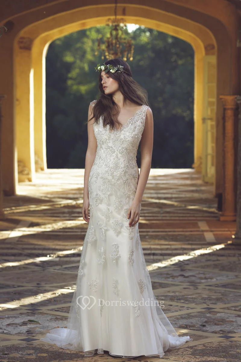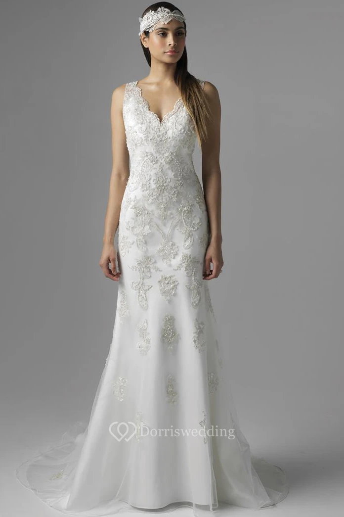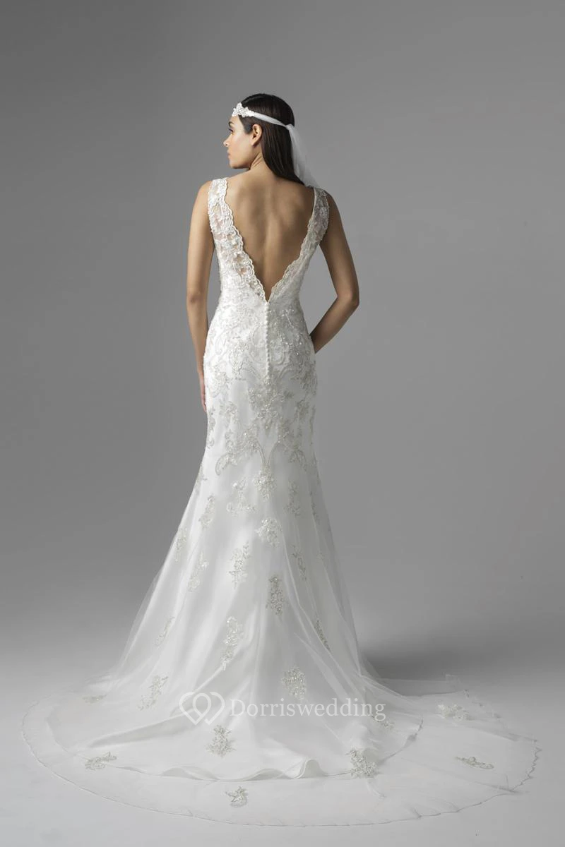 Sheath Floor-Length V-Neck Sleeveless Tulle&Satin Wedding Dress With Beading And Deep-V Back