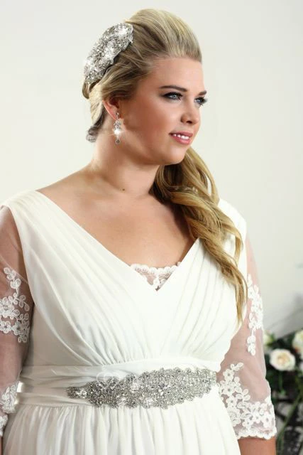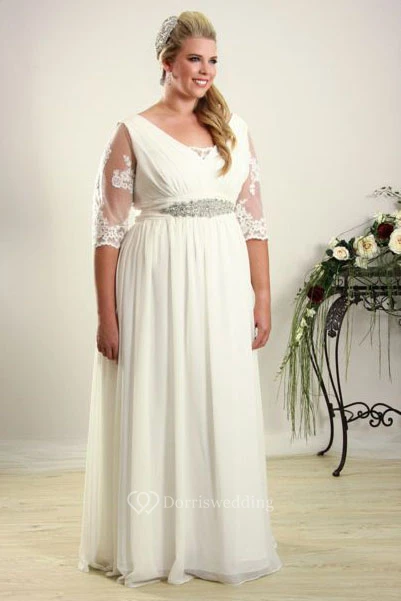 Sheath Half-Sleeve Jeweled V-Neck Chiffon Plus Size Wedding Dress