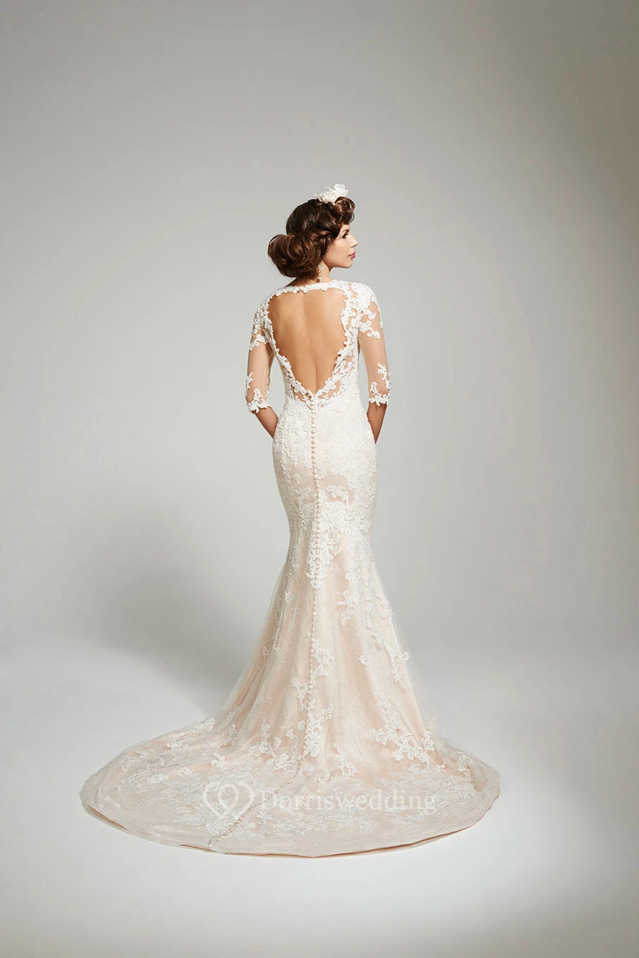 Sheath Half-Sleeve Sweetheart Long Appliqued Lace Wedding Dress With Court Train And Keyhole Back