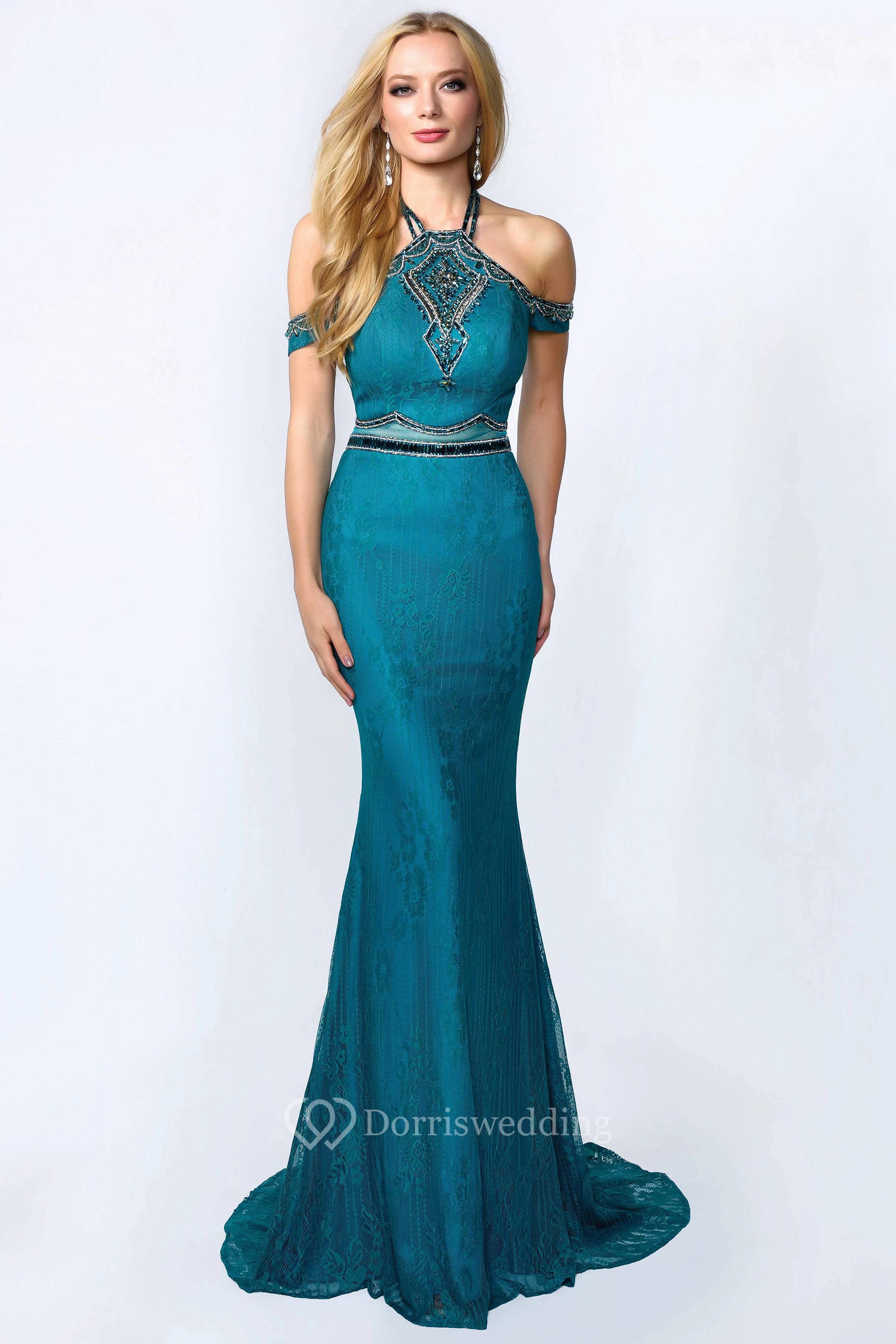 Sheath Halter Sleeveless Lace Backless Dress With Beading