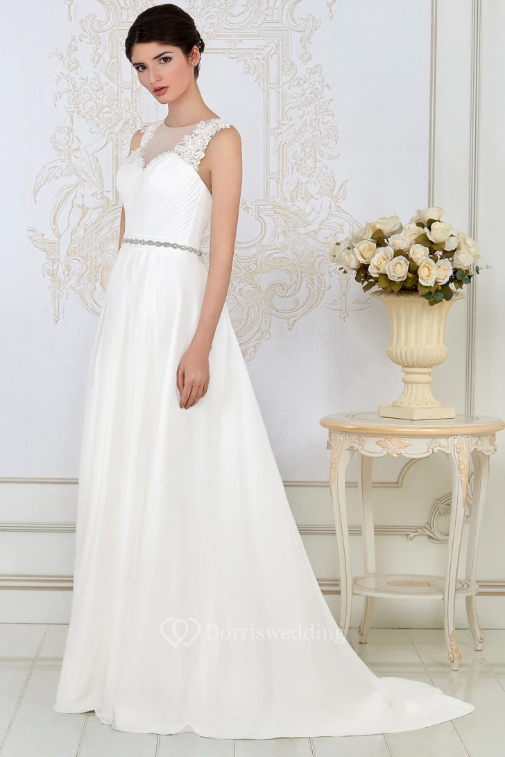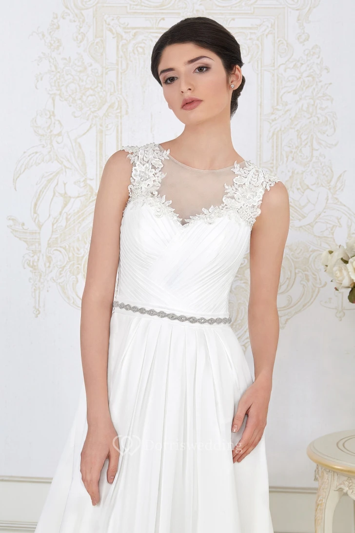 Sheath High-Neck Floor-Length Ruched Tulle&Satin Wedding Dress With Waist Jewellery And Appliques