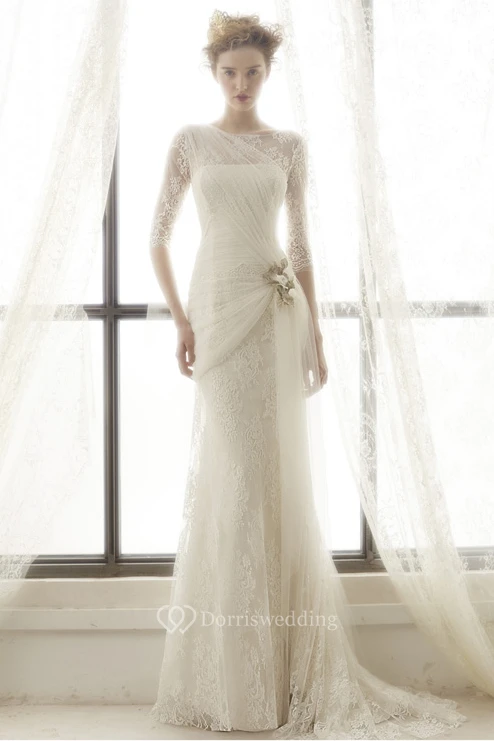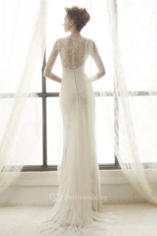 Sheath High Neck Half-Sleeve Tulle Wedding Dress With Lace And Draping