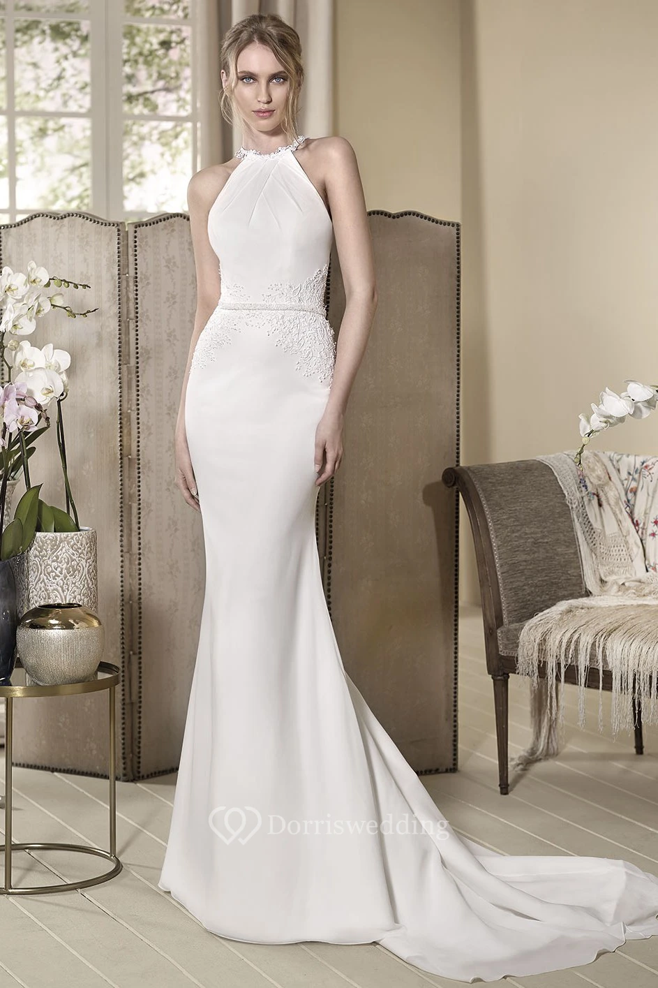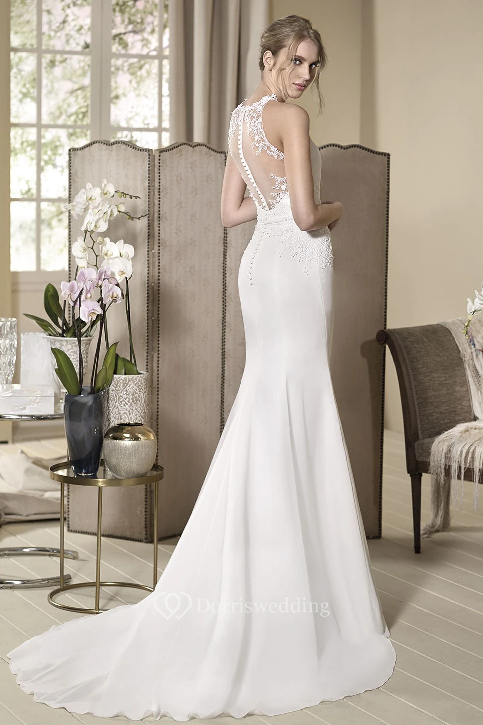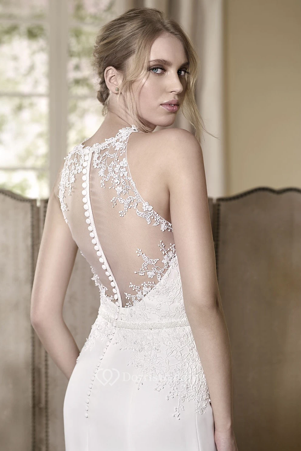 Sheath High-Neck Long Sleeveless Appliqued Simple Wedding Dress With Beading
