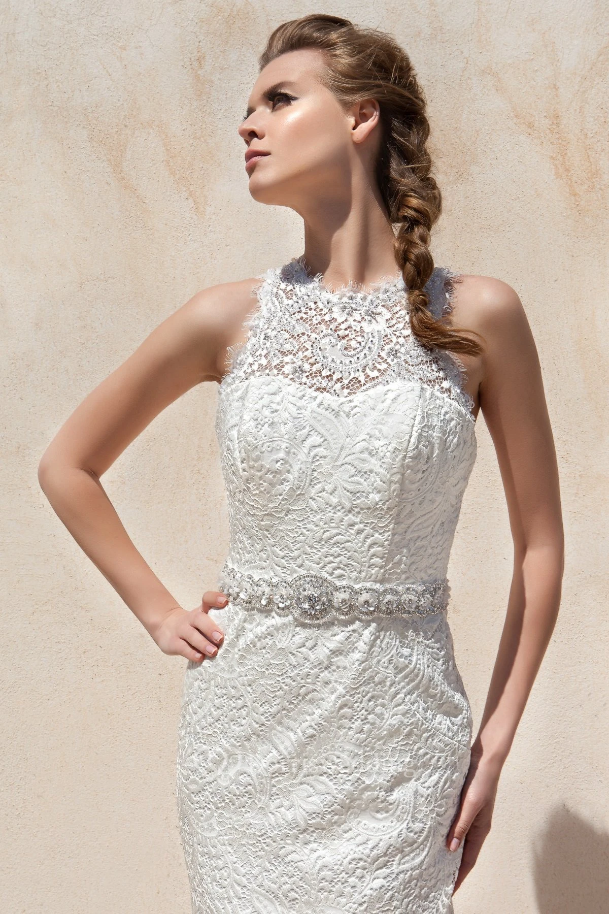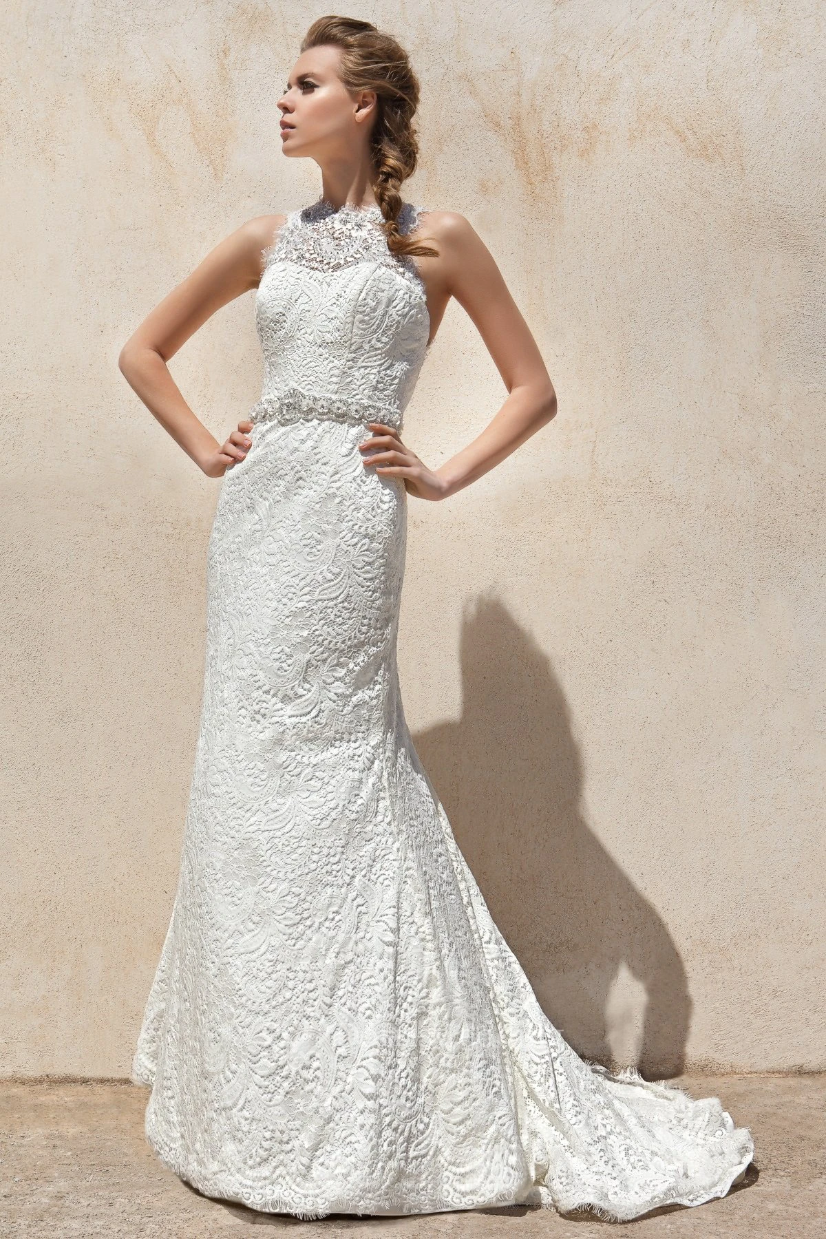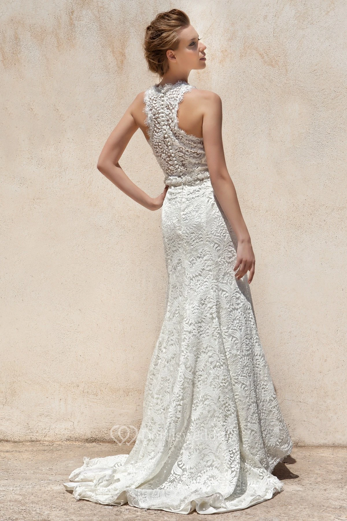 Sheath High-Neck Sleeveless Beaded Maxi Lace Wedding Dress With Appliques