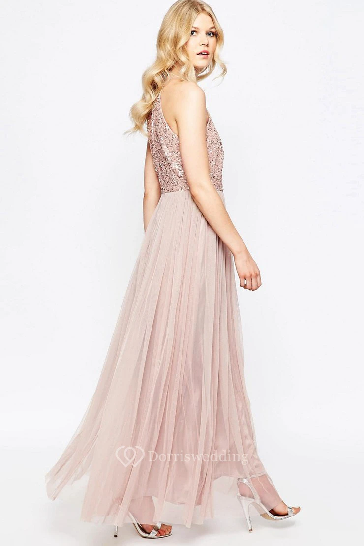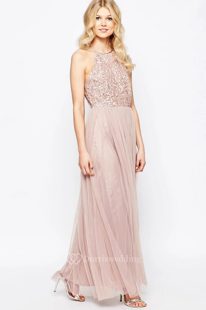 Sheath High Neck Sleeveless Floor-Length Tulle Bridesmaid Dress With Sequins