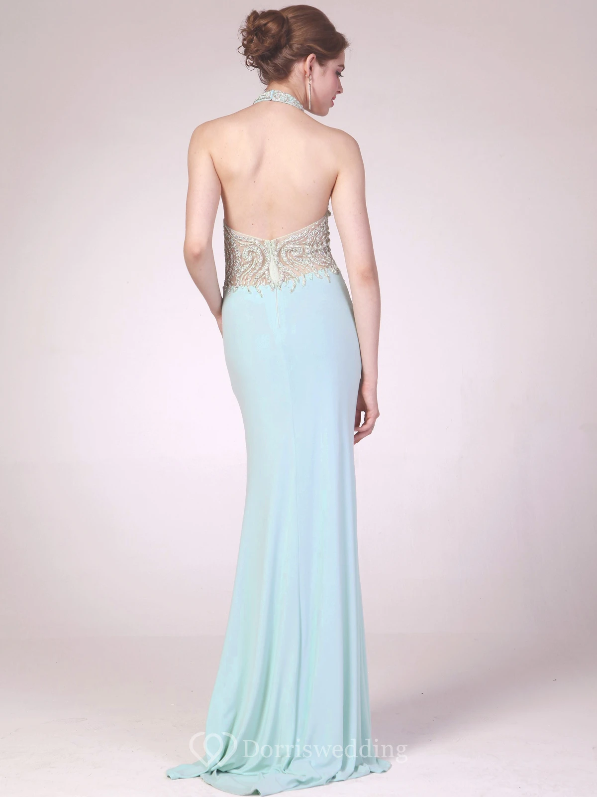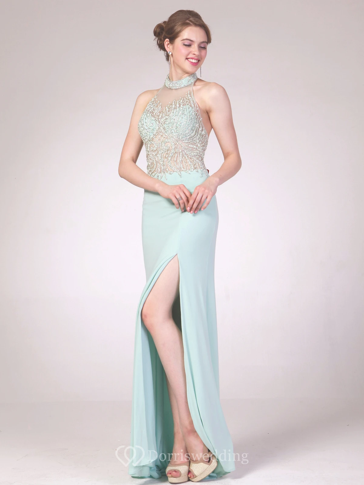 Sheath High Neck Sleeveless Jersey Backless Dress With Beading And Split Front