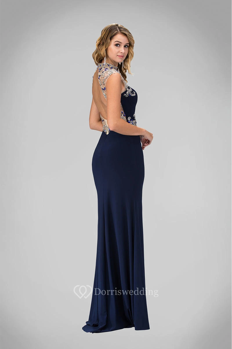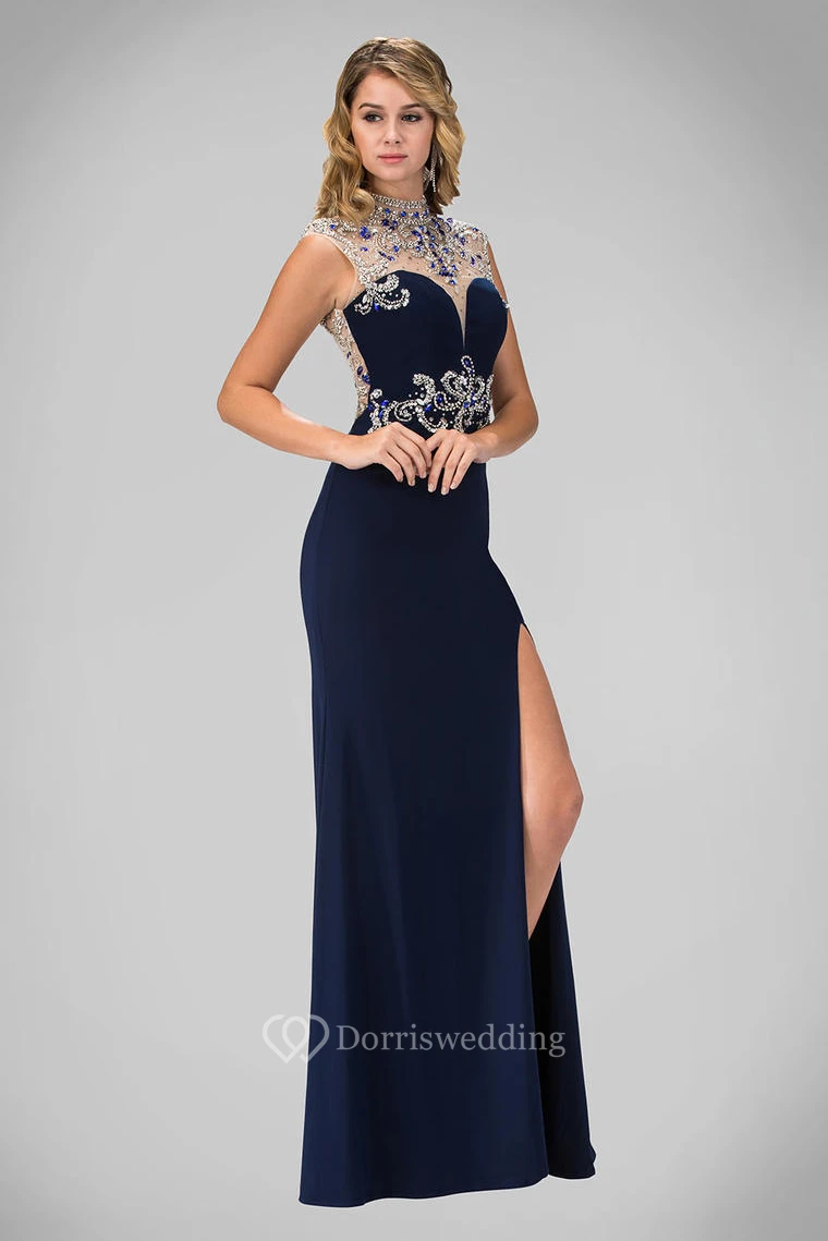 Sheath High Neck Sleeveless Jersey Keyhole Dress With Beading And Split Front