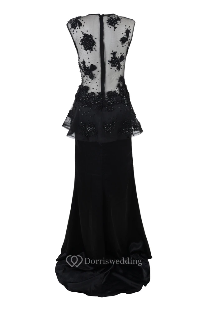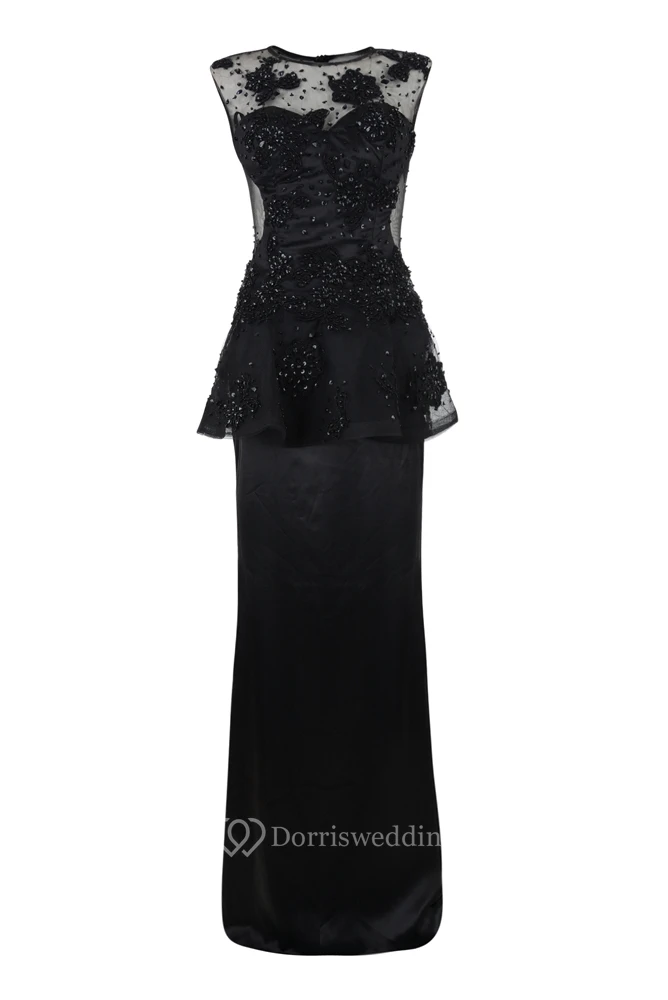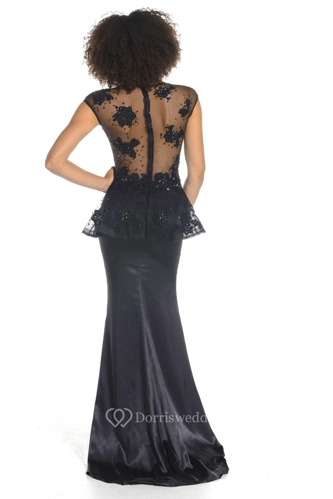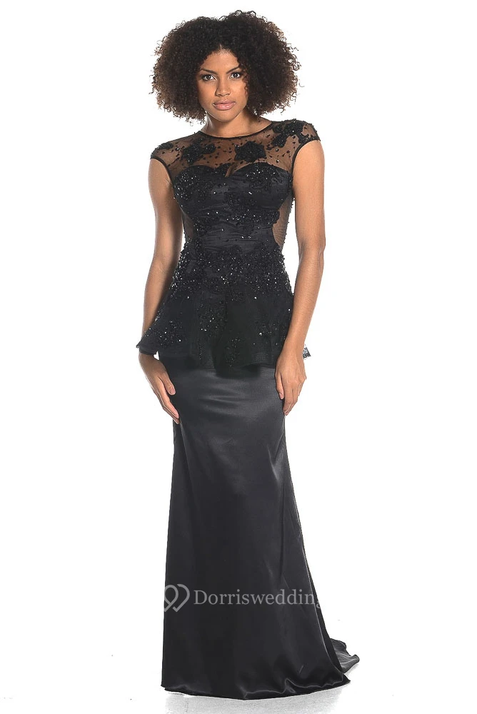 Sheath Jewel Appliqued Maxi Cap-Sleeve Satin Prom Dress With Beading And Peplum