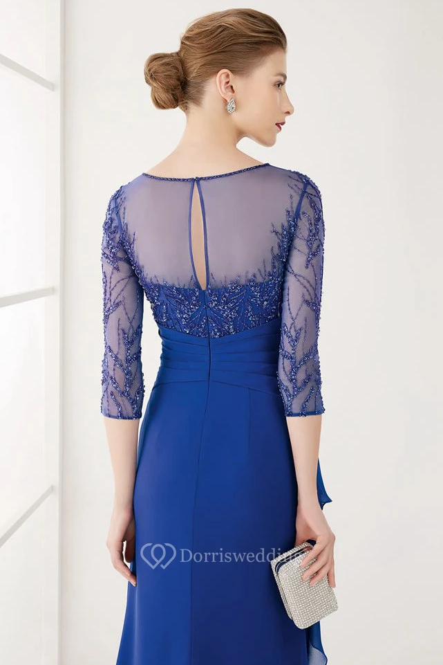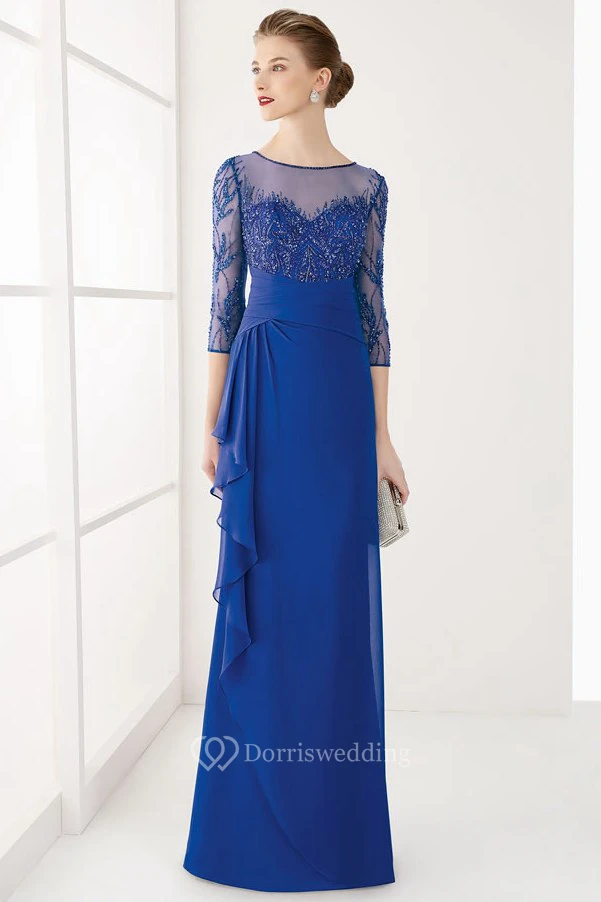 Sheath Jewel-Neck 3-4-Sleeve Long Draped Chiffon Prom Dress With Beading And Sequins