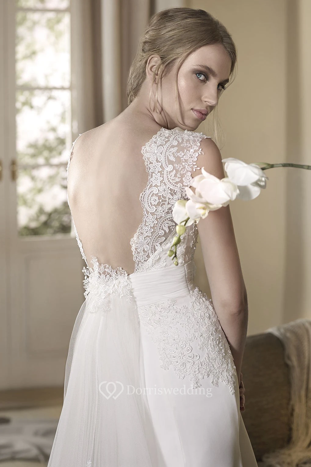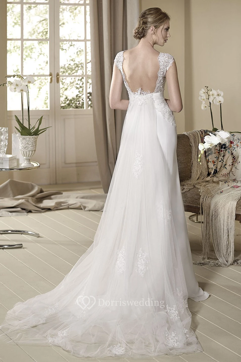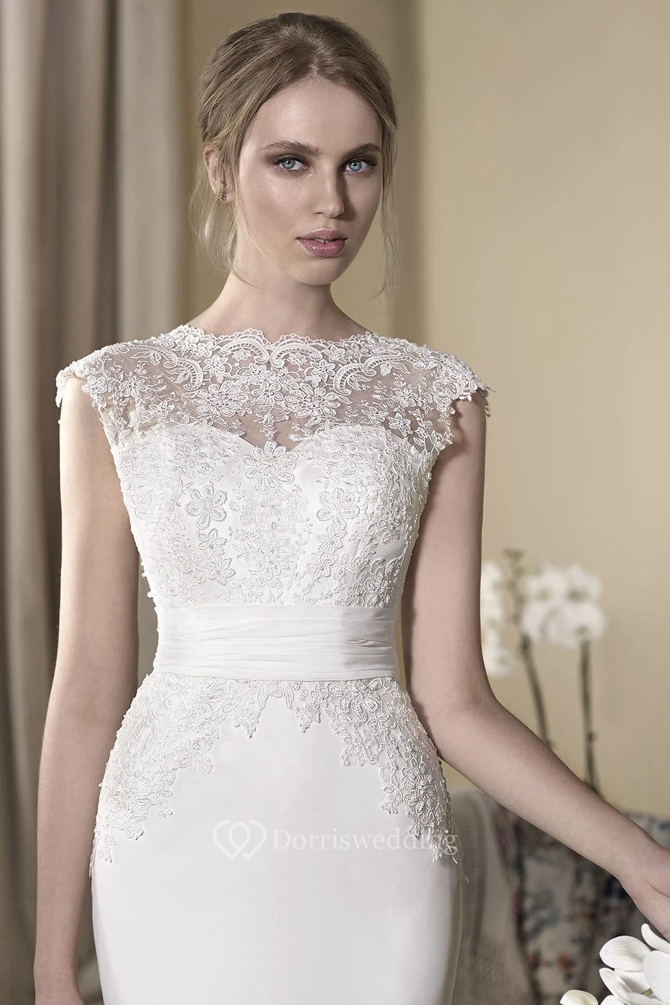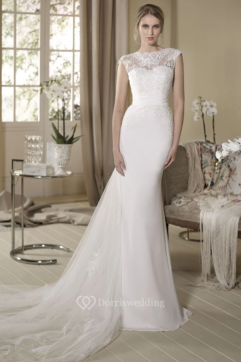 Sheath Jewel-Neck Appliqued Cap-Sleeve Long Tulle Wedding Dress
