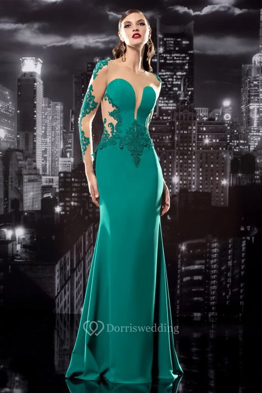 Sheath Jewel-Neck Long Sleeve Jersey Illusion Dress With Appliques