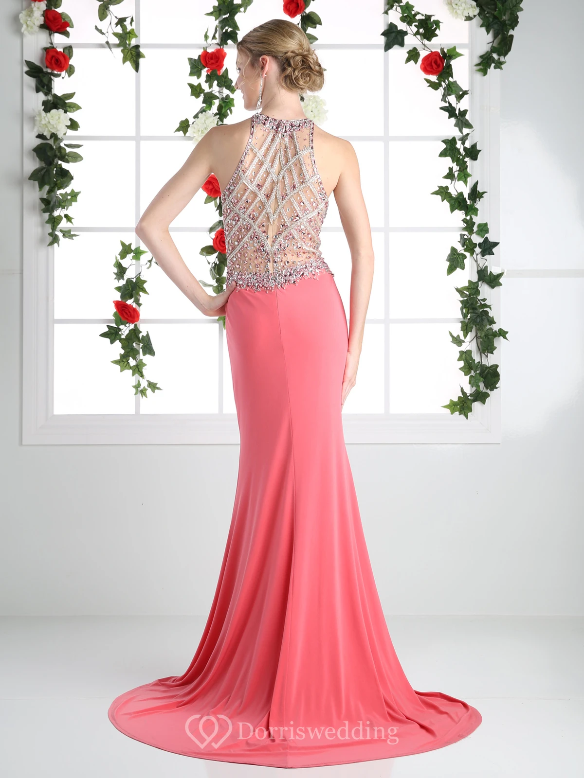 Sheath Jewel-Neck Sleeveless Jersey Illusion Dress With Beading And Split Front