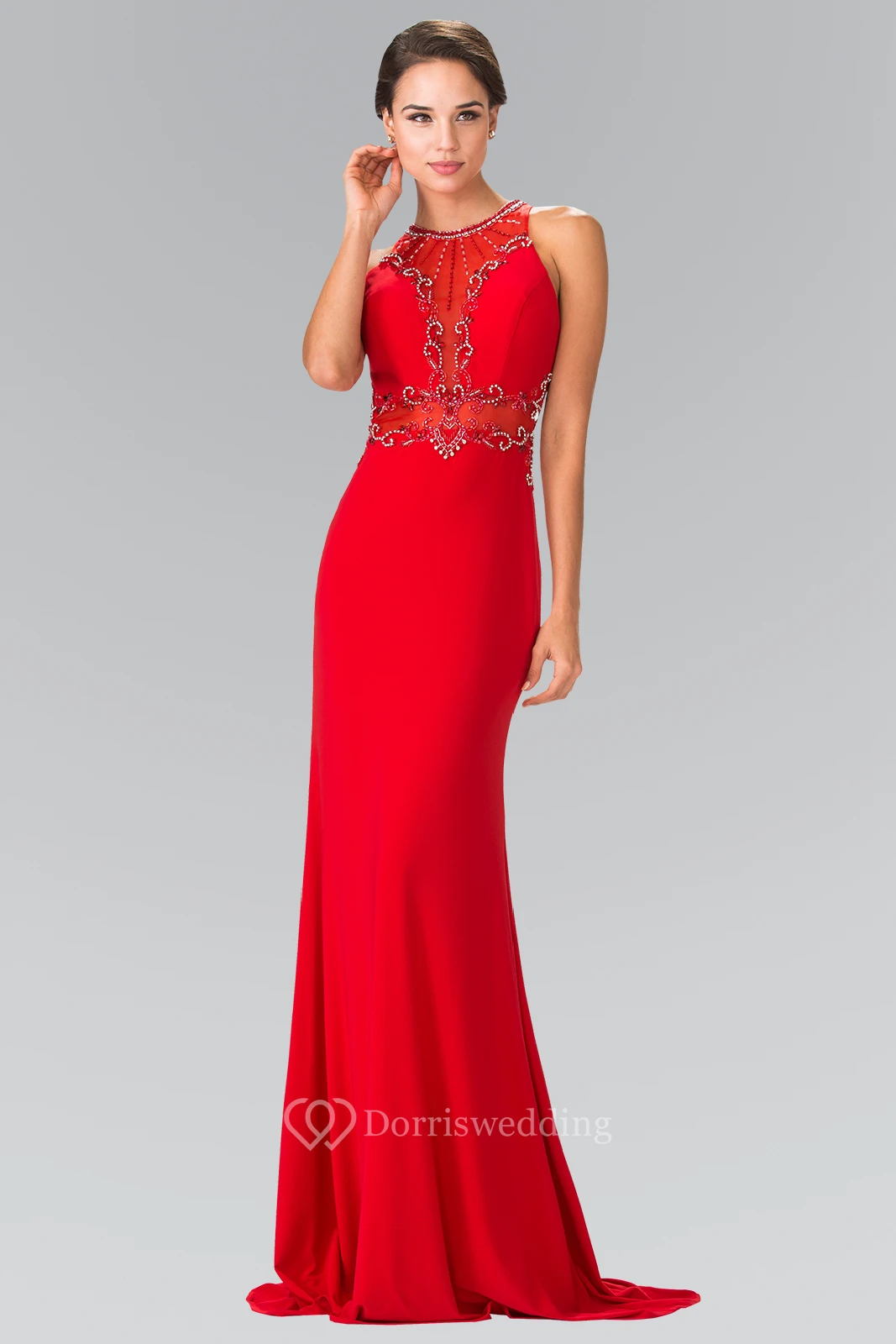 Sheath Jewel-Neck Sleeveless Jersey Illusion Dress With Beading