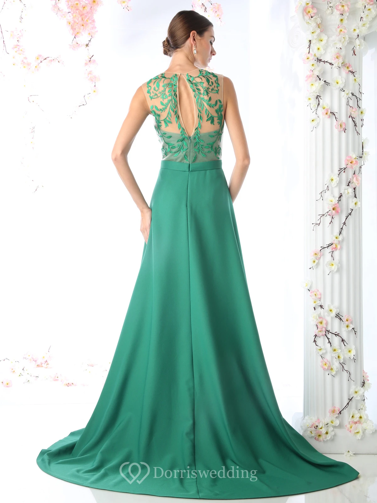 Sheath Jewel-Neck Sleeveless Jersey Illusion Dress With Embroidery And Split Front