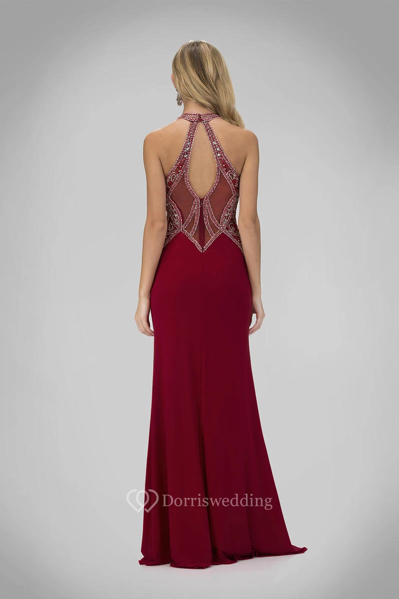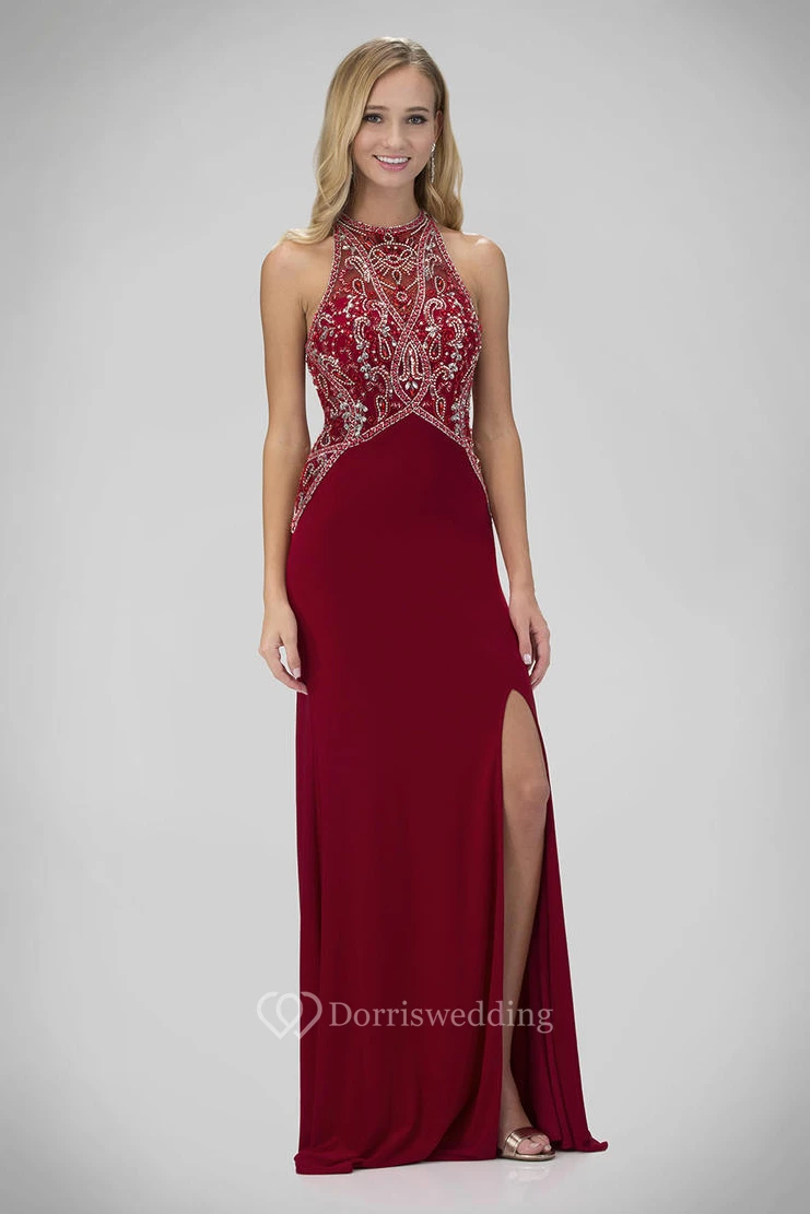 Sheath Jewel-Neck Sleeveless Jersey Straps Dress With Split Front And Beading