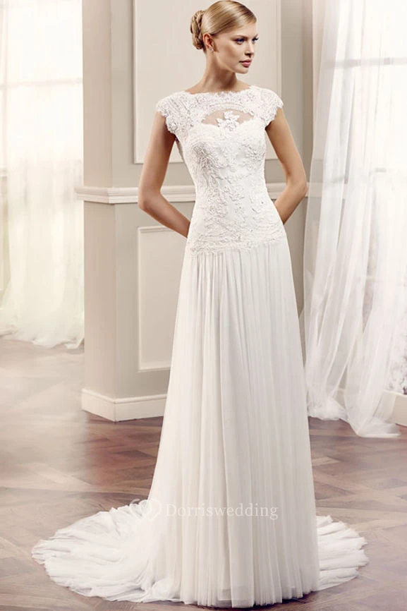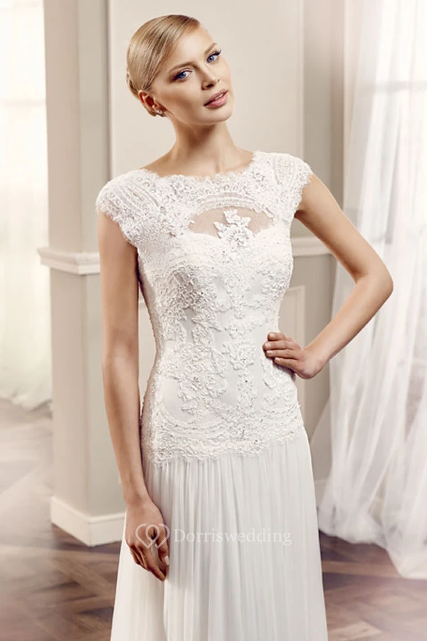 Sheath Jewel-Neck Sleeveless Pleated Chiffon&Lace Wedding Dress With Illusion