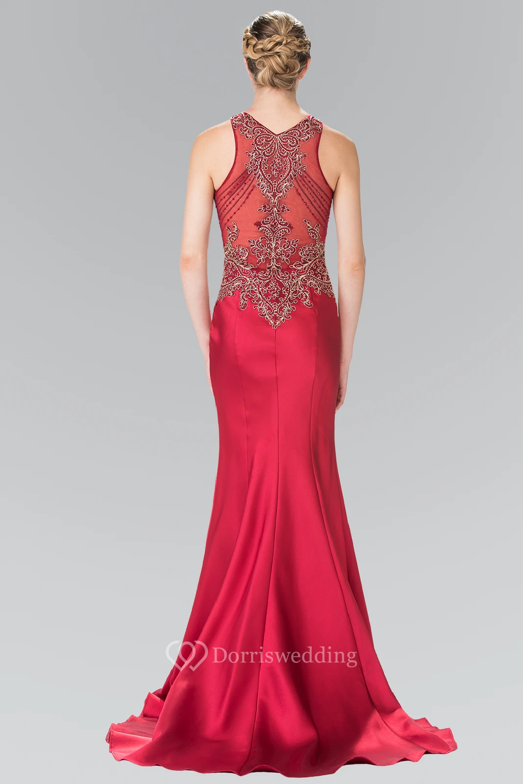 Sheath Jewel-Neck Sleeveless Satin Illusion Dress With Appliques