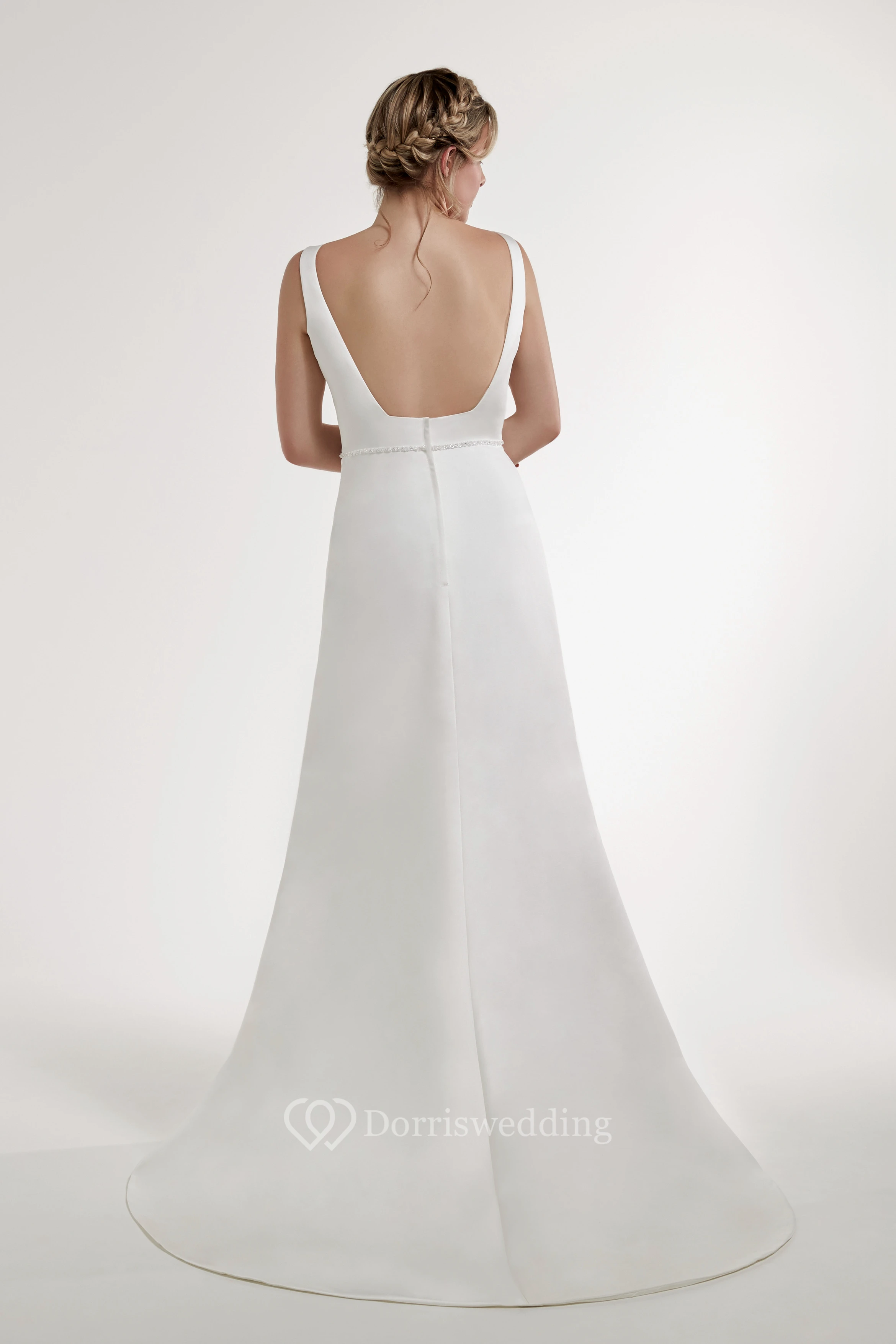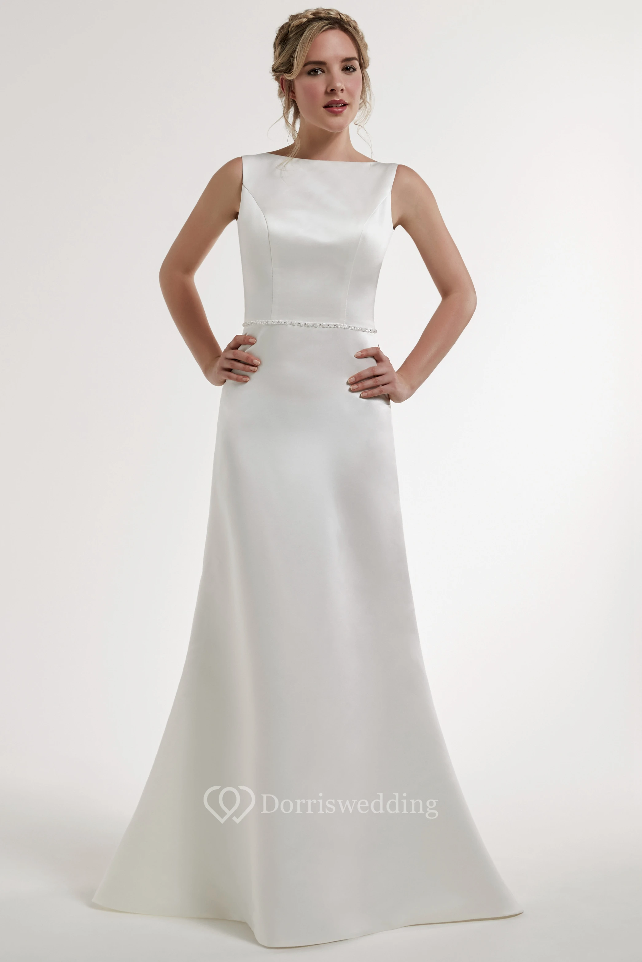 Sheath Jeweled Jewel Floor-Length Sleeveless Satin Wedding Dress With Backless Style And Sweep Train