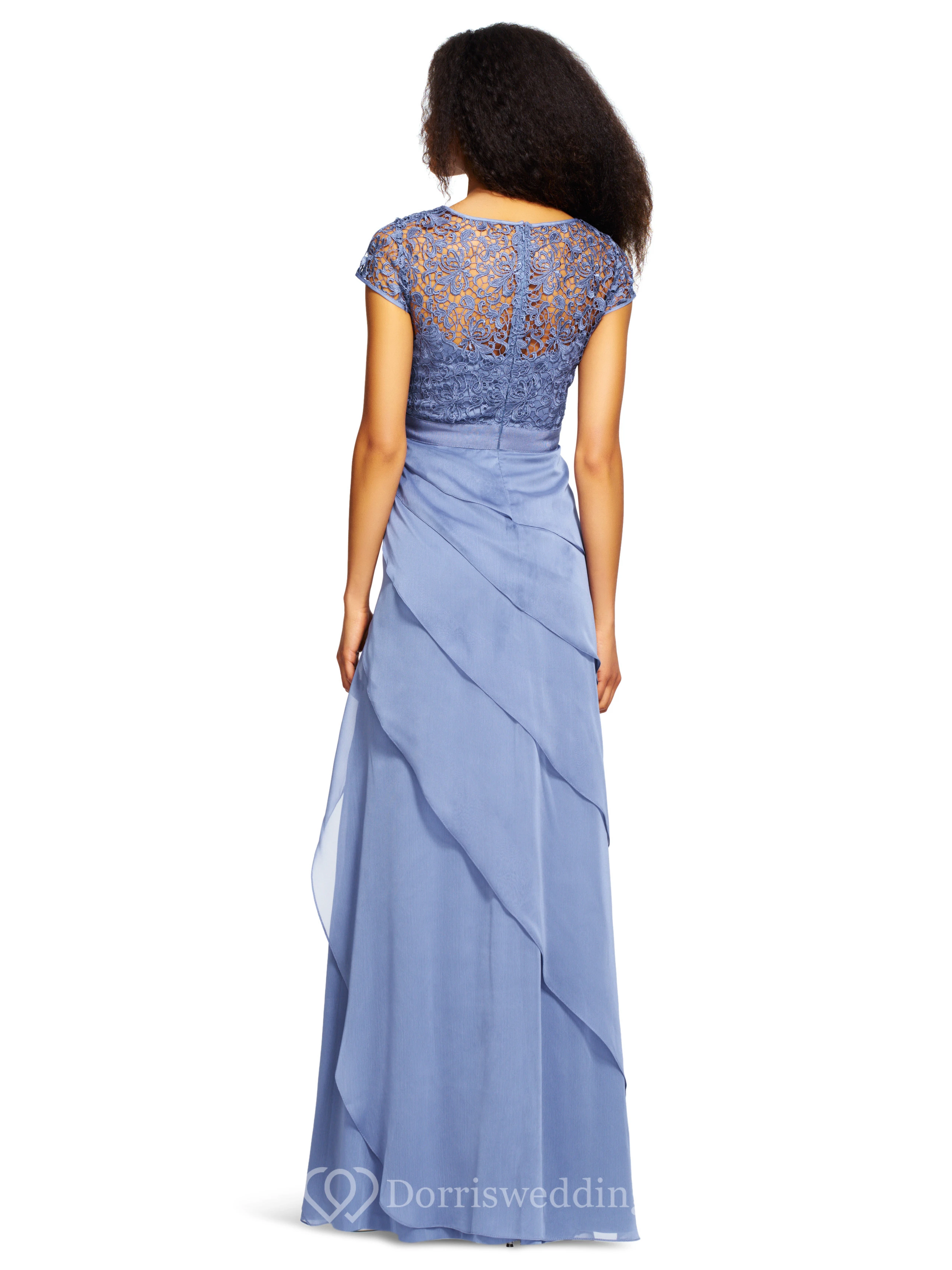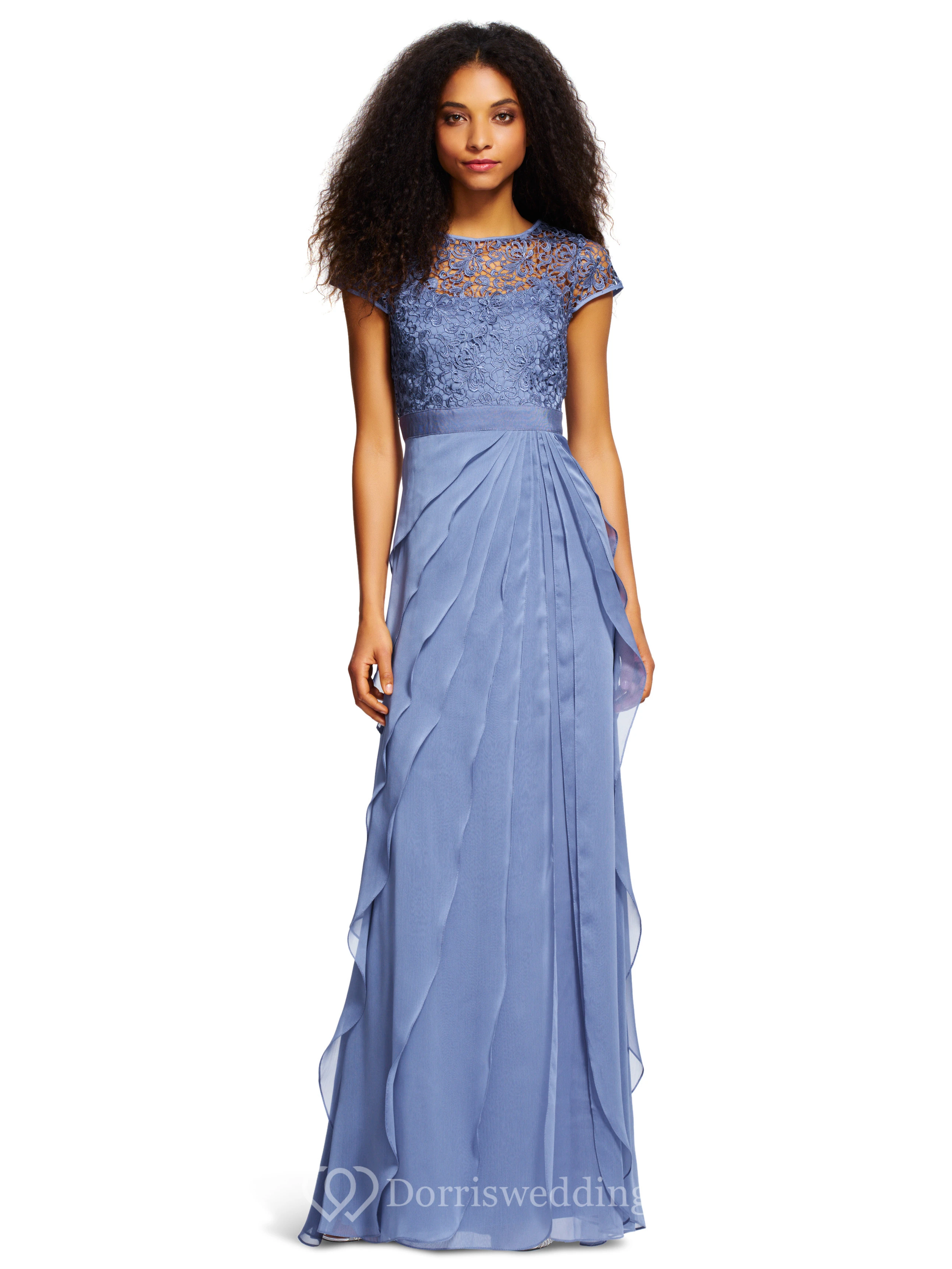 Sheath Lace Scoop-Neck Short-Sleeve Floor-Length Chiffon Bridesmaid Dress With Draping