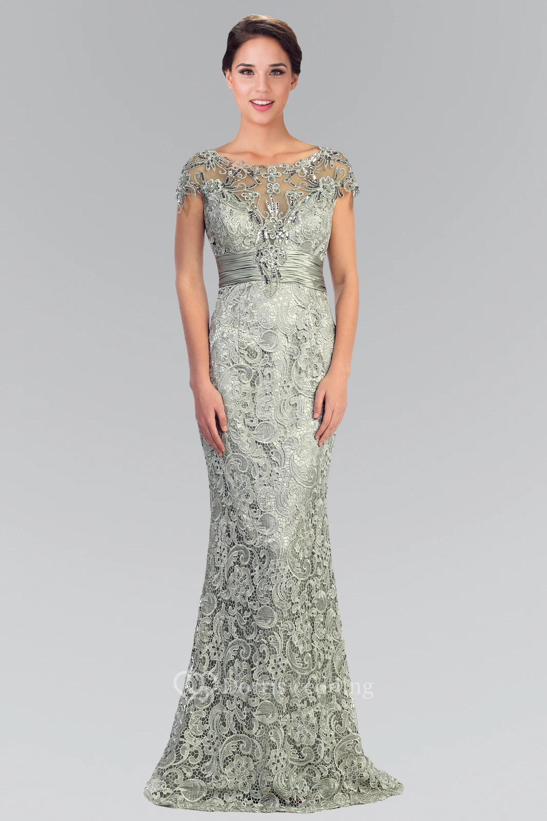 Sheath Long Bateau Short Sleeve Lace Dress With Sequins