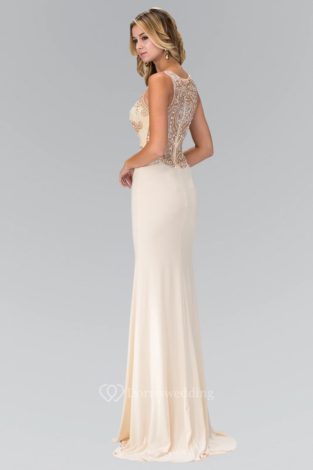 Sheath Long Bateau Sleeveless Jersey Illusion Dress With Split Front And Beading