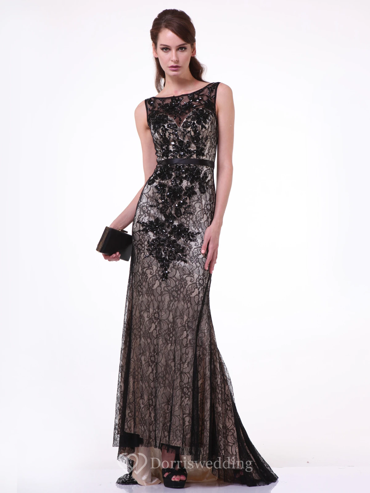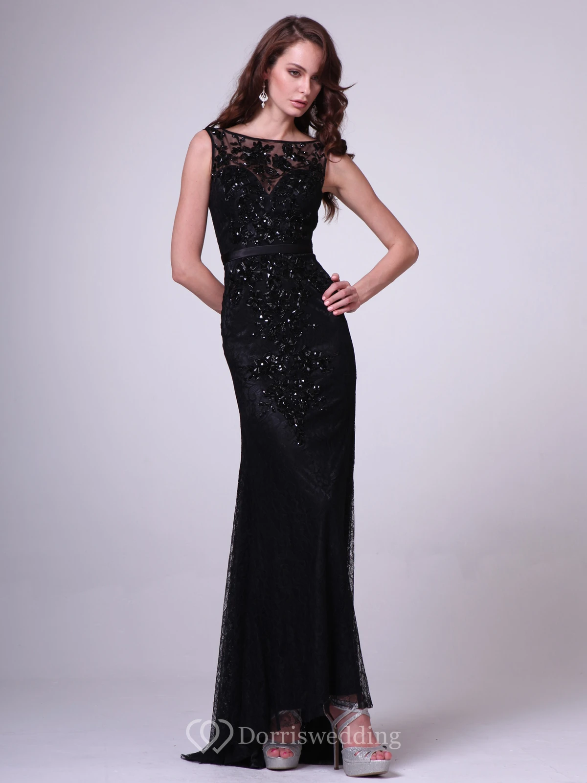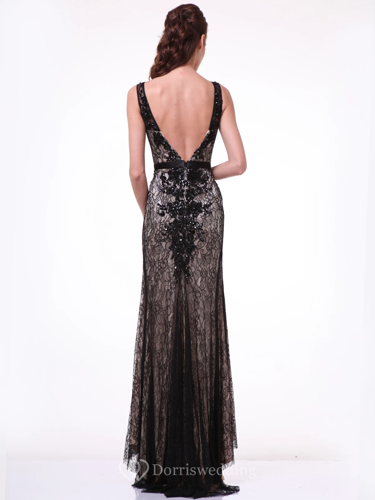 Sheath Long Bateau Sleeveless Lace Deep-V Back Dress With Appliques And Pleats