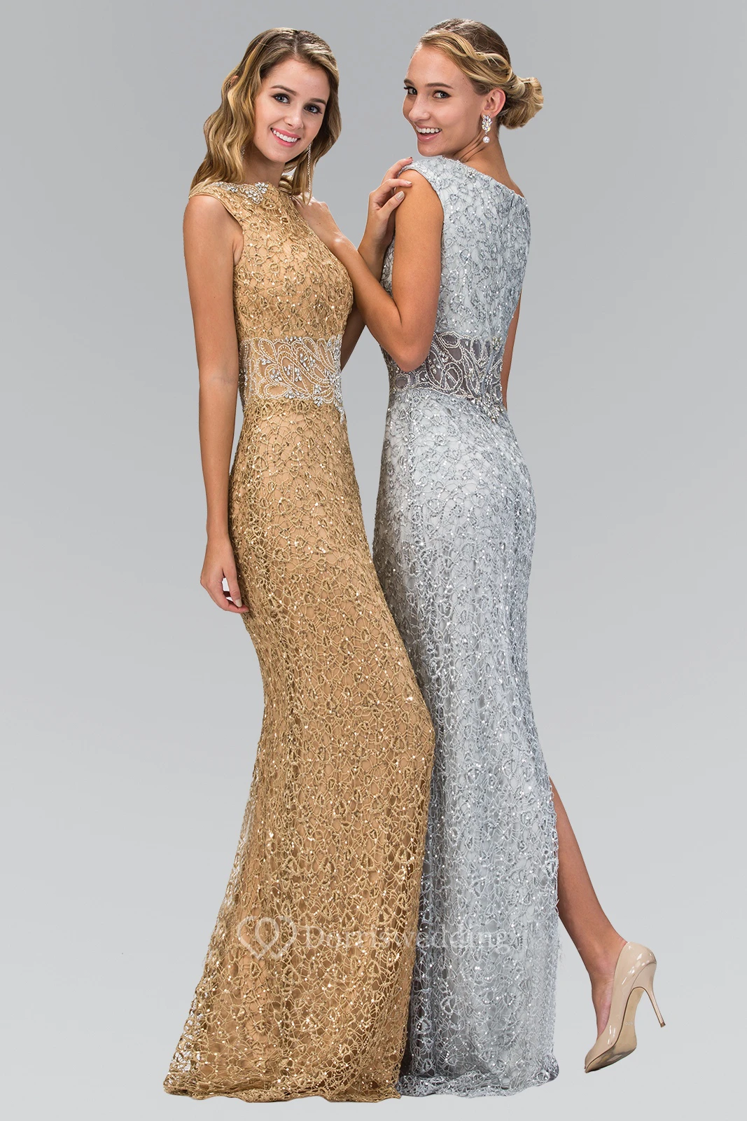 Sheath Long Bateau Sleeveless Lace Dress With Beading