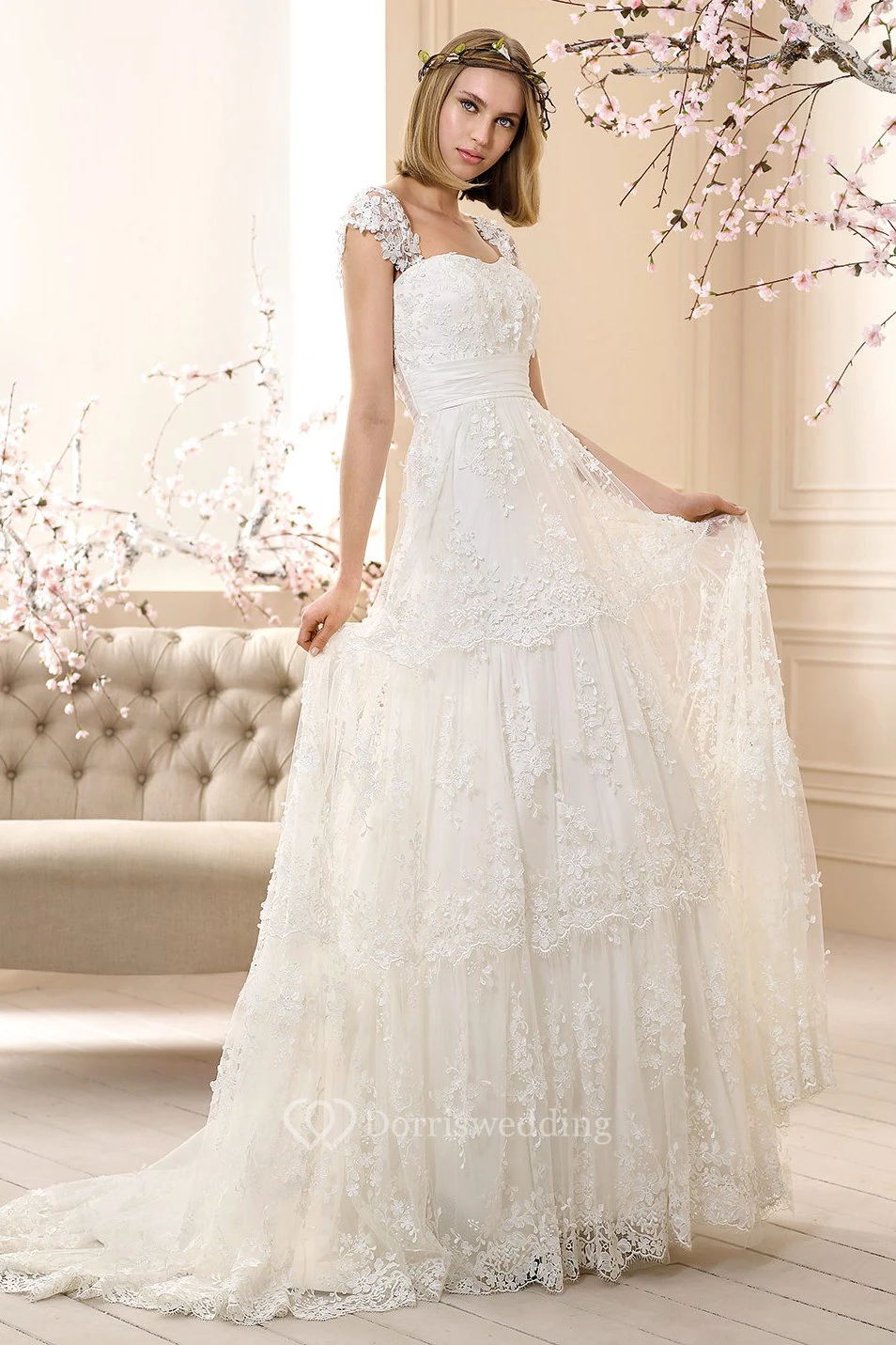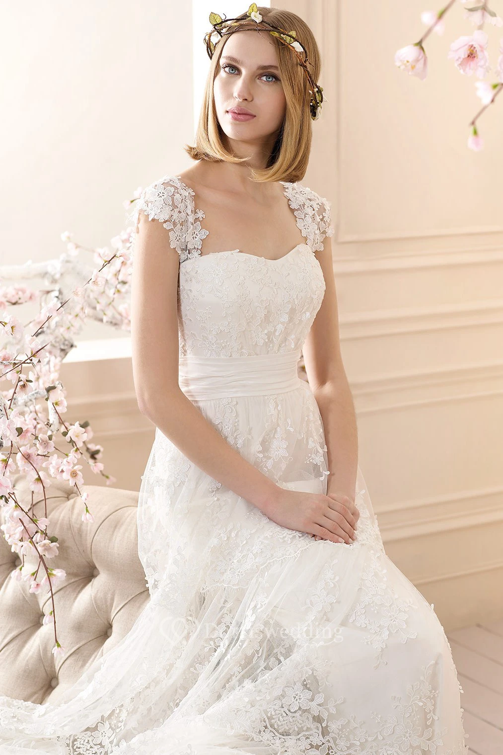 Sheath Long Cap-Sleeve Appliqued Lace Wedding Dress With Pleats