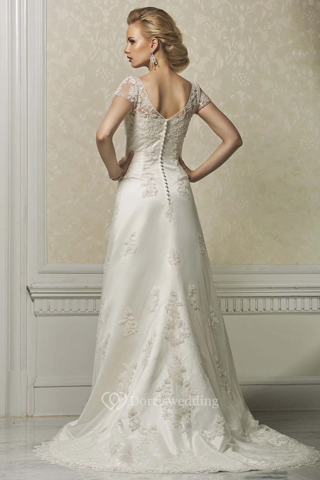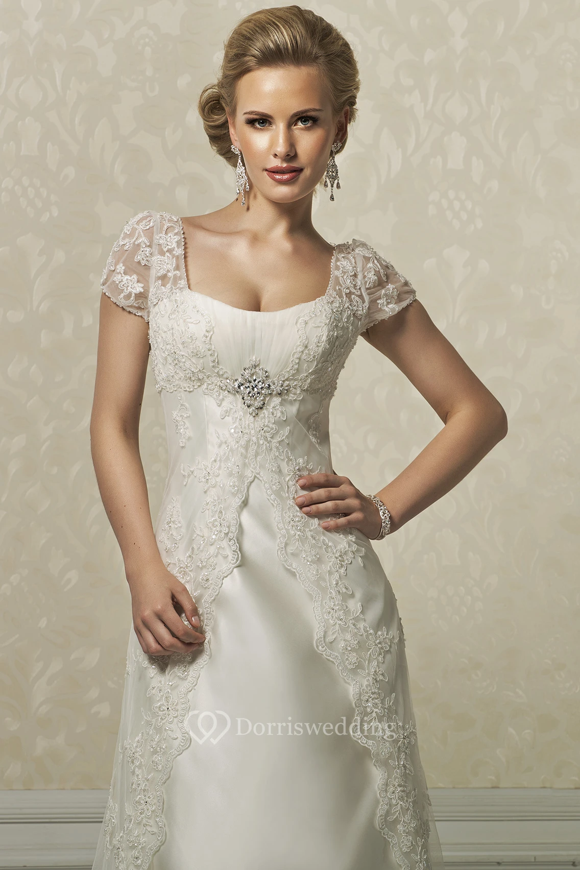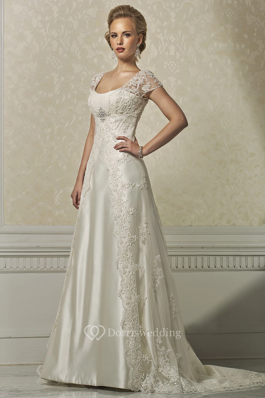 Sheath Long Cap-Sleeve Appliqued Square-Neck Satin&Lace Wedding Dress