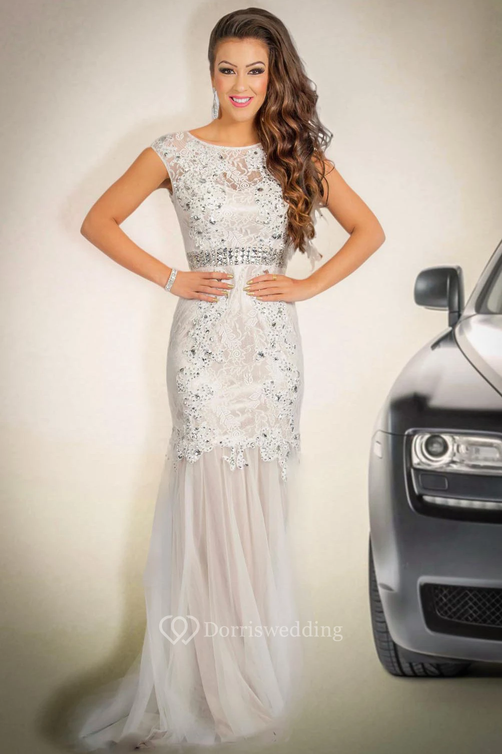 Sheath Long Cap-Sleeve Beaded Scoop-Neck Lace&Tulle Prom Dress With Waist Jewellery
